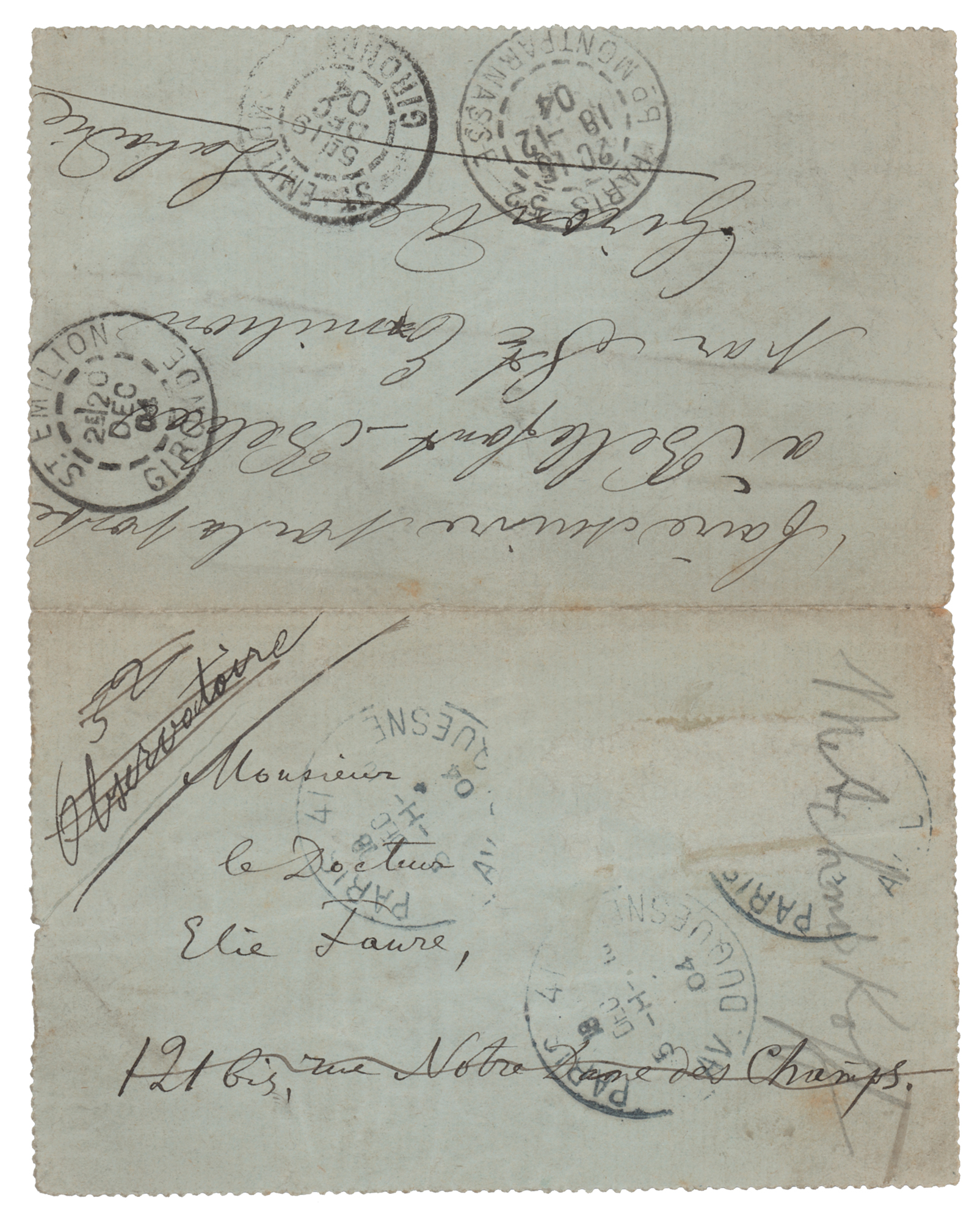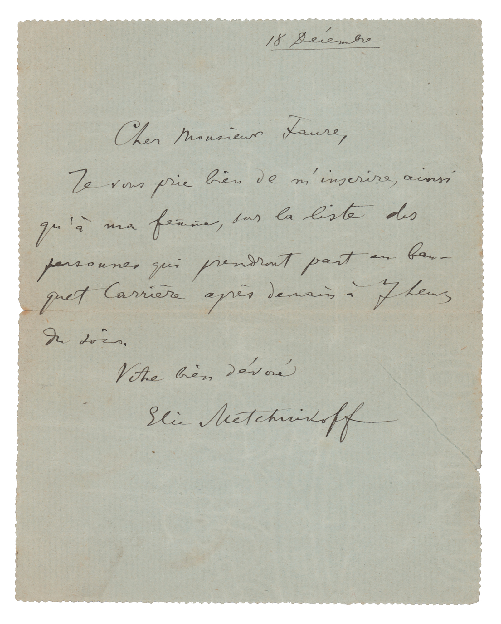 Russian biologist and zoologist (1845-1916) best known for his pioneering research into the immune system for which he, with Paul Ehrlich, was awarded the 1908 Nobel Prize in Physiology or Medicine. ALS in French, one page, 4.75 x 5.75, December 18. An untranslated handwritten letter to French art historian and essayist Élie Faure. In fine condition, with a small split to the end of the central horizontal fold.