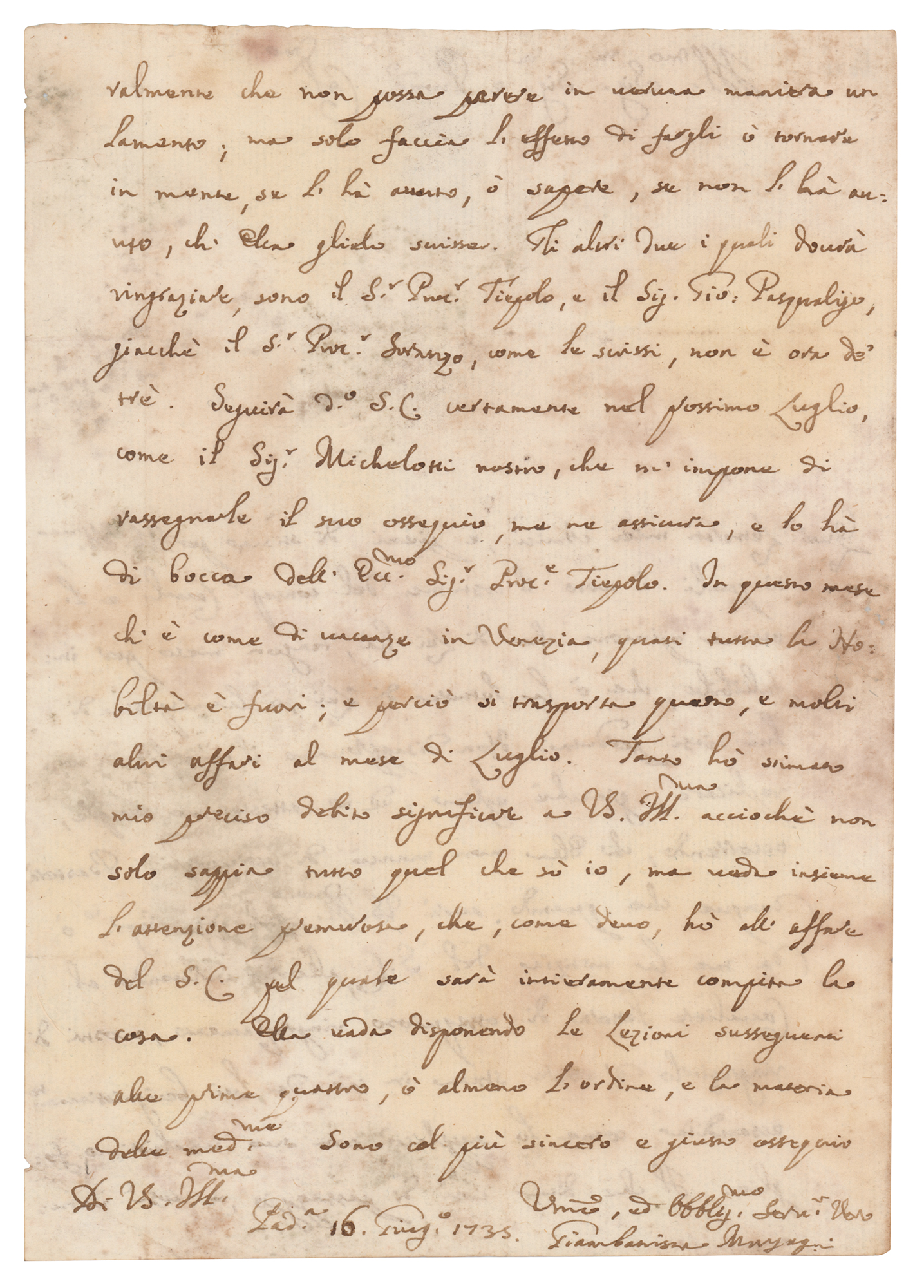 Italian anatomist (1682-1771) celebrated as the father of modern anatomical pathology. Rare ALS in Italian, three pages on two adjoining sheets, 5.5 x 8, June 16, 1735. Untranslated handwritten letter by Morgagni. In very good to fine condition, with overall light staining, and seal-related paper loss to the integral address leaf.