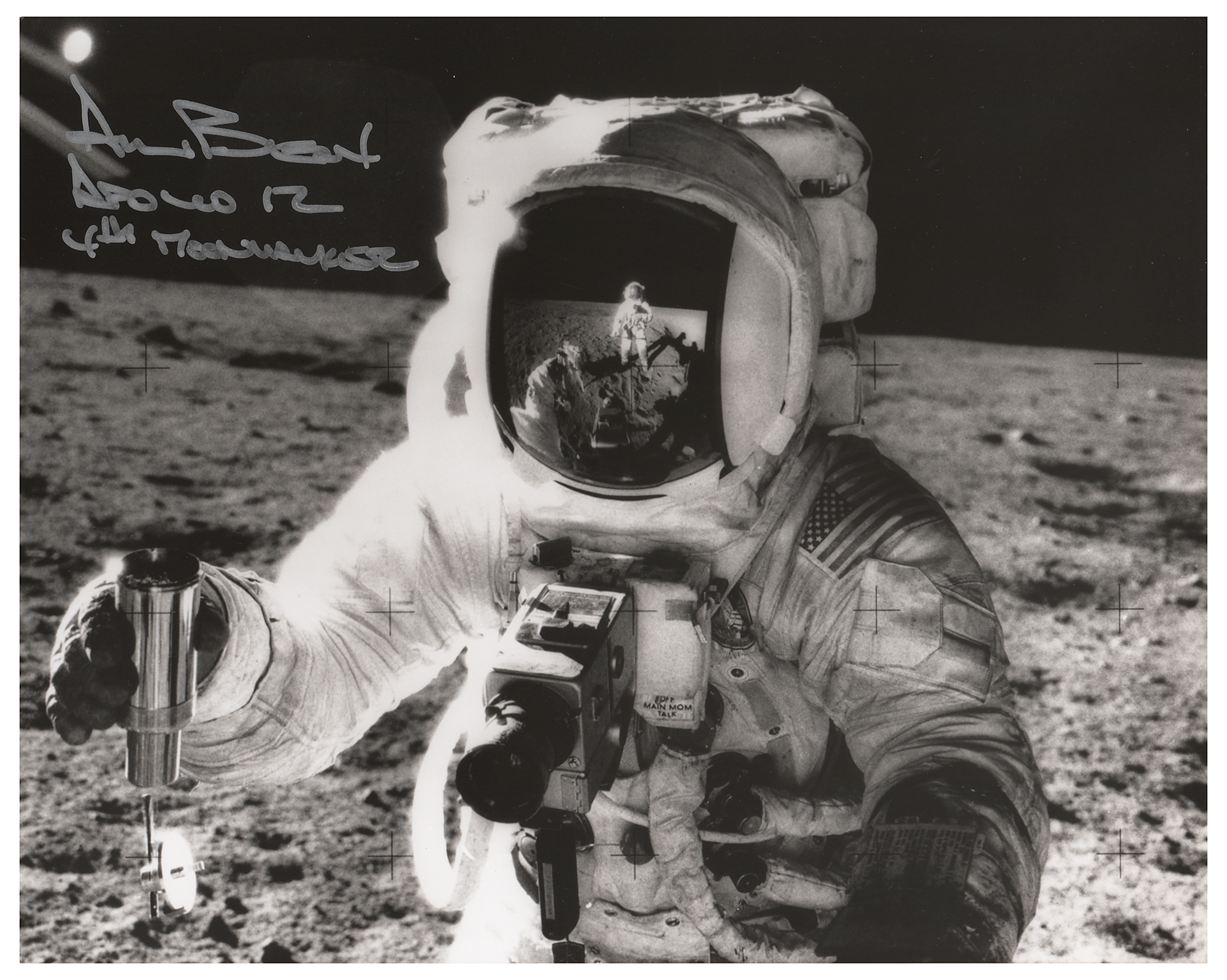 Satin-finish 10 x 8 photo of LMP Bean holding up a lunar sample canister, signed in silver ink, "Alan Bean, Apollo 12, 4th Moonwalker." In fine condition.