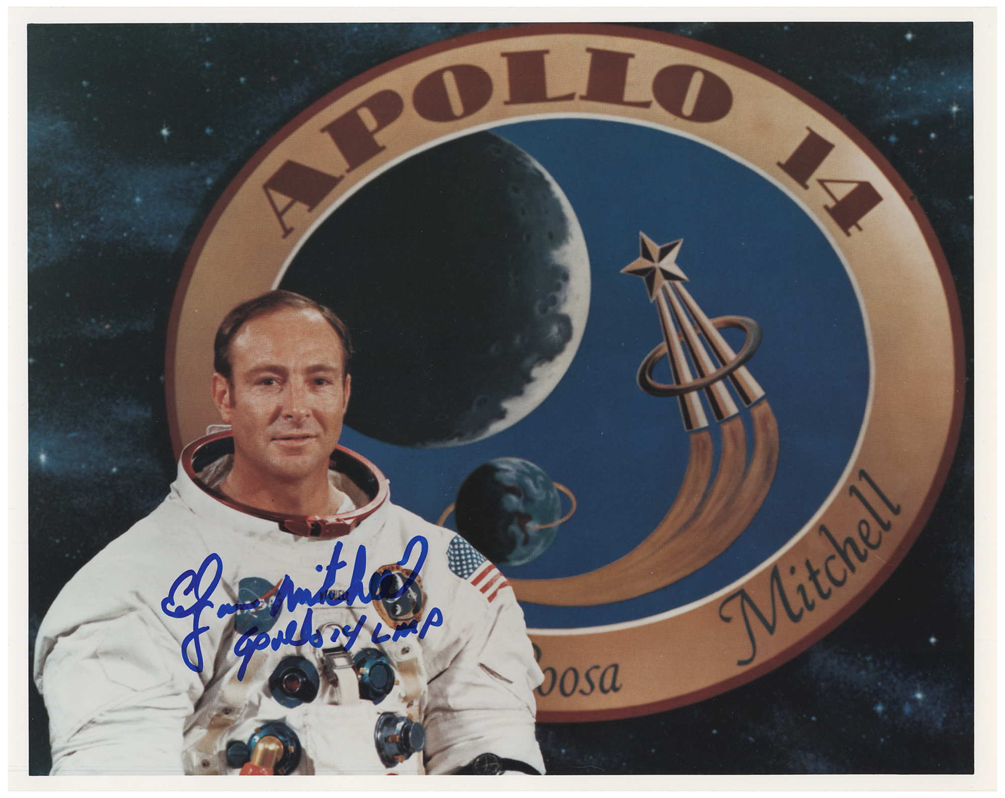 Color satin-finish 10 x 8 photo of LMP Mitchell posing in his white space suit against the Apollo 14 mission insignia, signed in blue felt tip, "Edgar Mitchell, Apollo 14 LMP." In fine condition, with a few small surface creases.