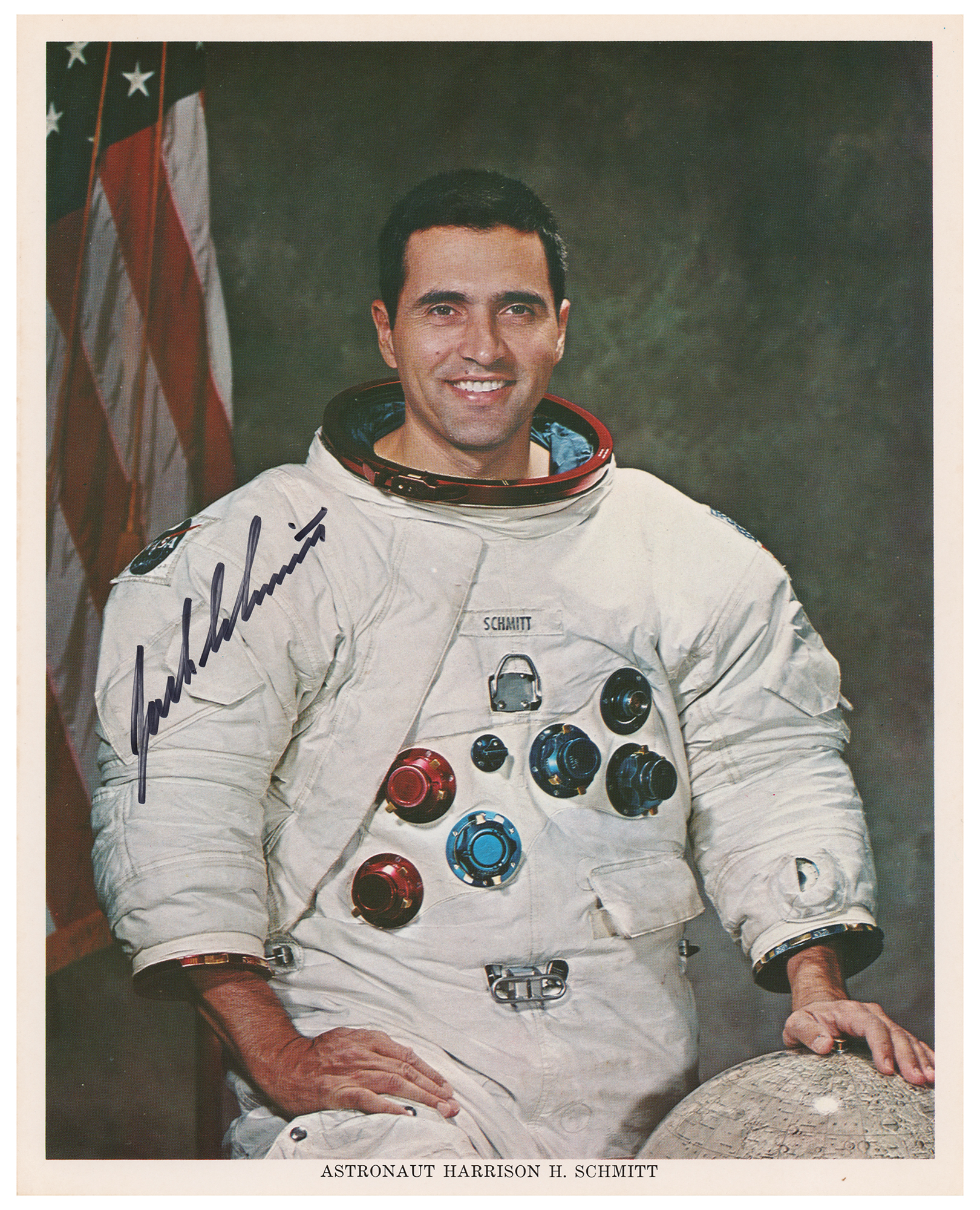 Official color 8 x 10 NASA lithograph of Schmitt posing in his white space suit with a lunar globe, signed in black felt tip, "Jack Schmitt." In fine condition, with scattered small surface creases.