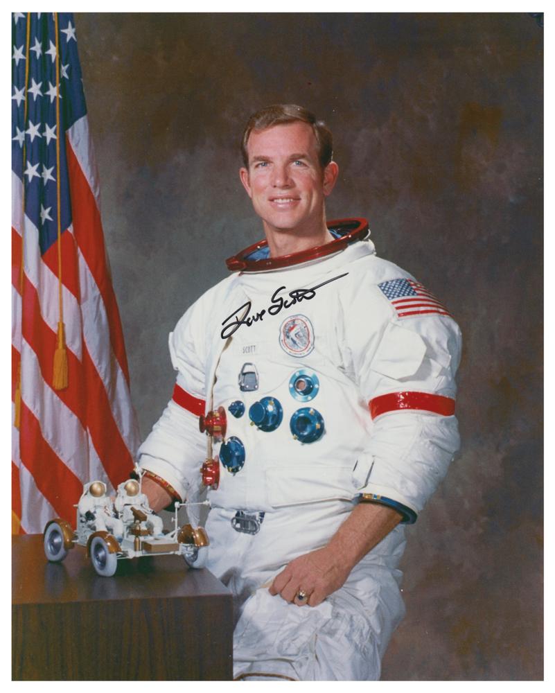 Color glossy 8 x 10 photo of CDR Scott posing with a model of the Lunar Roving Vehicle, signed in black felt tip, "Dave Scott." In fine condition, with a few small surface creases.