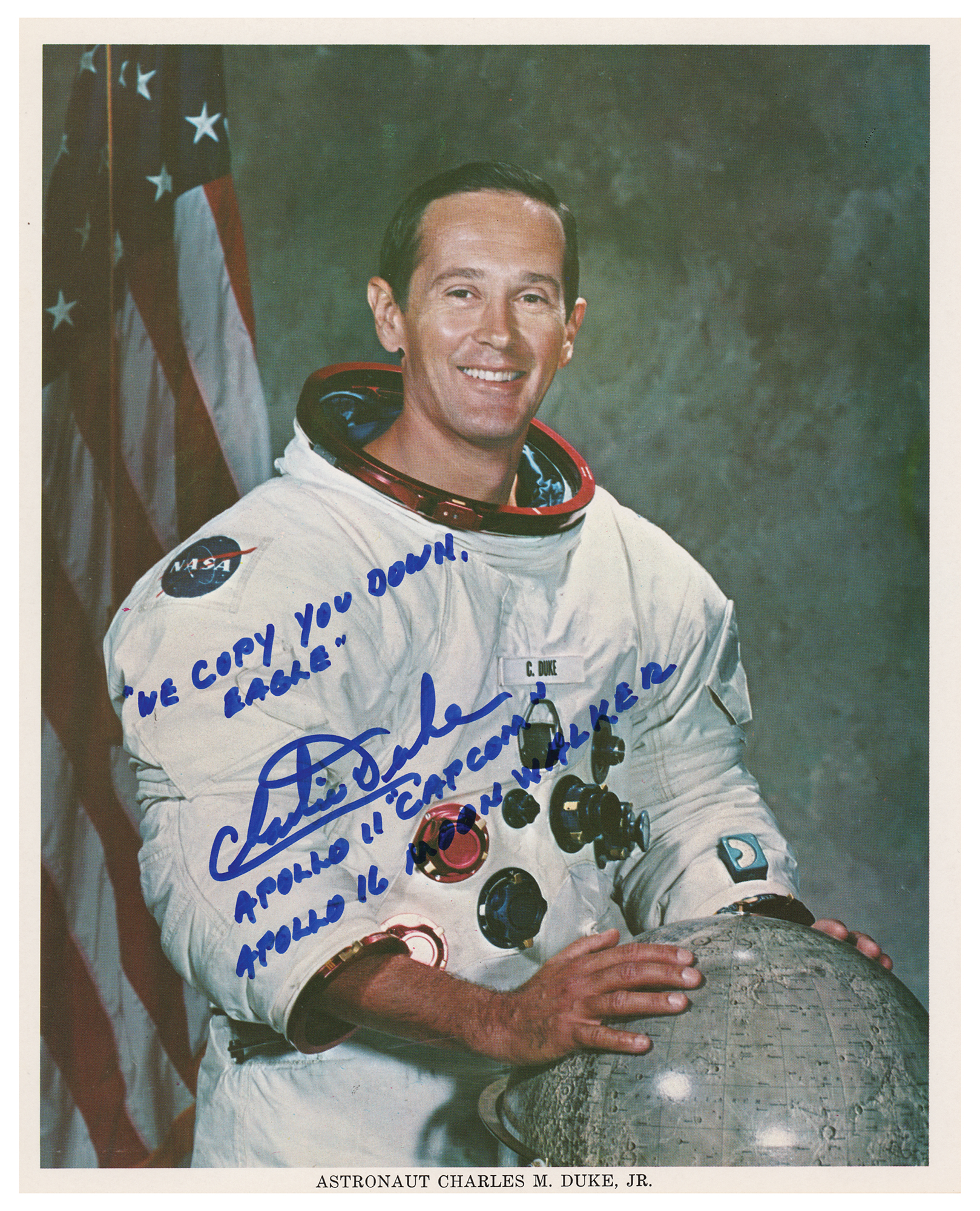 Official color 8 x 10 NASA lithograph of Duke posing in his white space suit with a lunar globe, signed in blue felt tip, "'We copy you down, Eagle,' Charlie Duke, Apollo 11 'CAPCOM,' Apollo 16 Moonwalker." In fine condition, with scattered small surface creases. Accompanied by a small photograph of Duke holding up the photo after signing.
