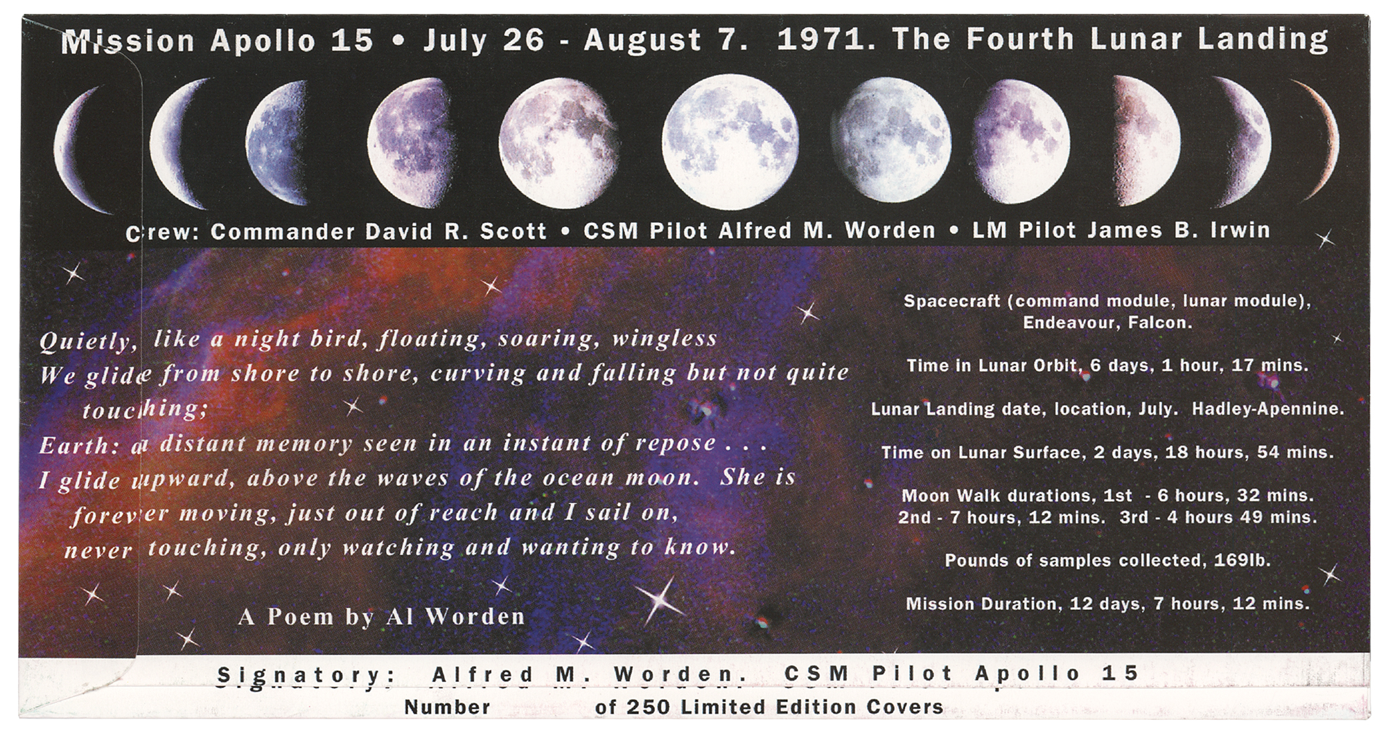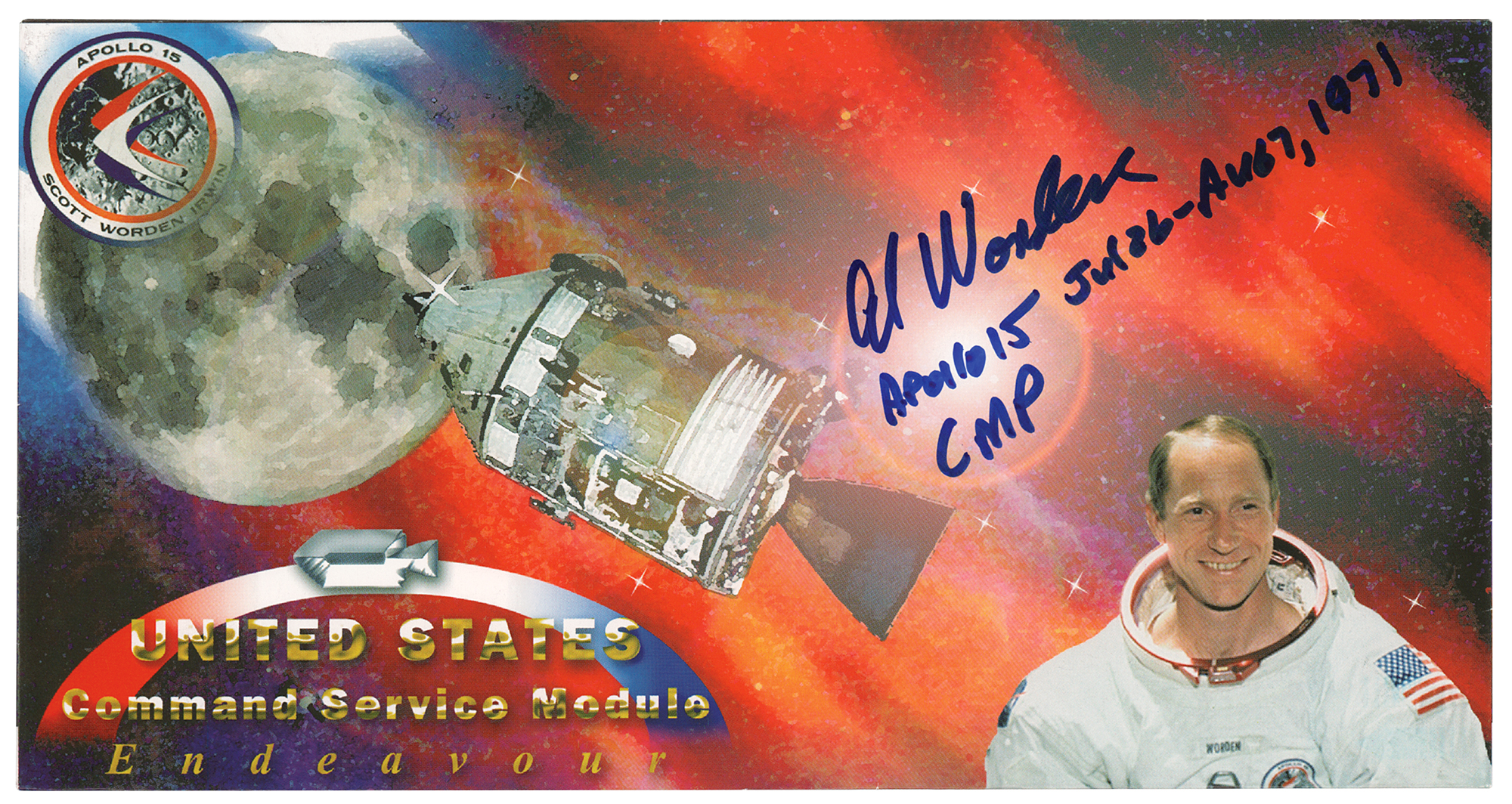 Limited edition commemorative cover honoring Worden's flight on the Command Module Endeavor, signed in blue felt tip, "Al Worden, Apollo 15, Jul. 26-Aug. 7, 1971, CMP." Reverse indicates that it is a part of a limited edition of 250 covers, but is not numbered. In fine condition.