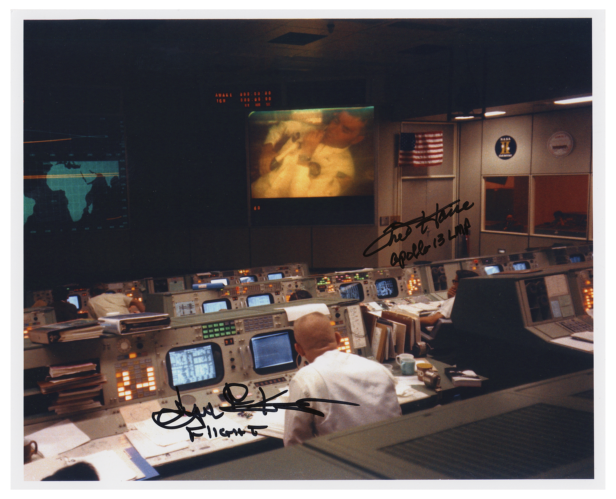 Color satin-finish 10 x 8 photo of Mission Control with Flight Director Gene Kranz in the foreground and LMP Fred Haise on the television screen in the background, signed in black felt tip, "Fred Haise, Apollo 13 LMP" and "Eugene F. Kranz, Flight." In very fine condition.
