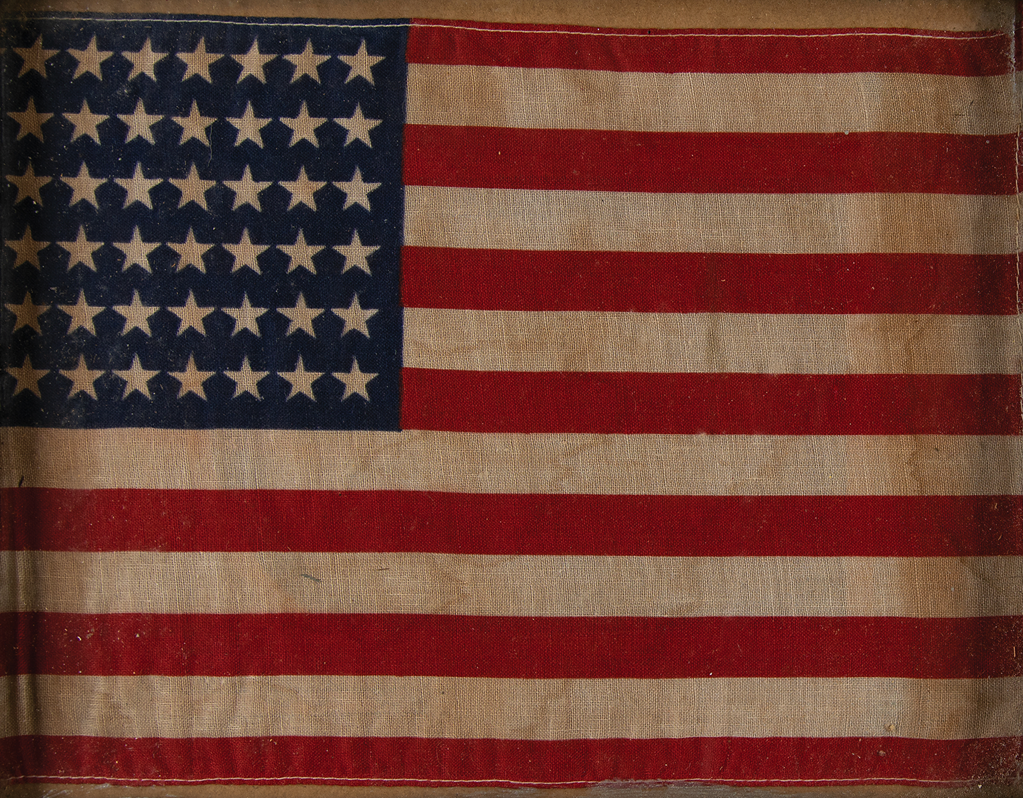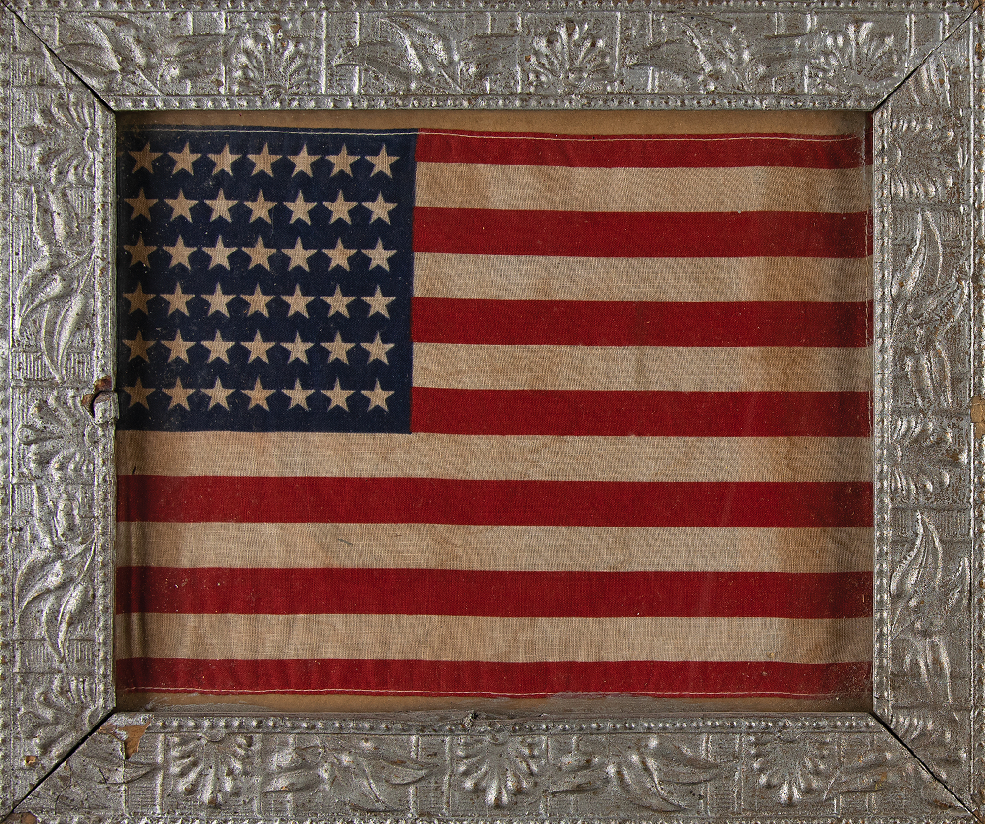 Unofficial block-printed 42-star American national parade flag (Washington statehood), 9.75 x 7, cotton fabric with sewn edges, featuring a canton with a rectilinear star pattern. Framed and in very good to fine condition, with toning and dampstaining; not examined outside of vintage frame.
