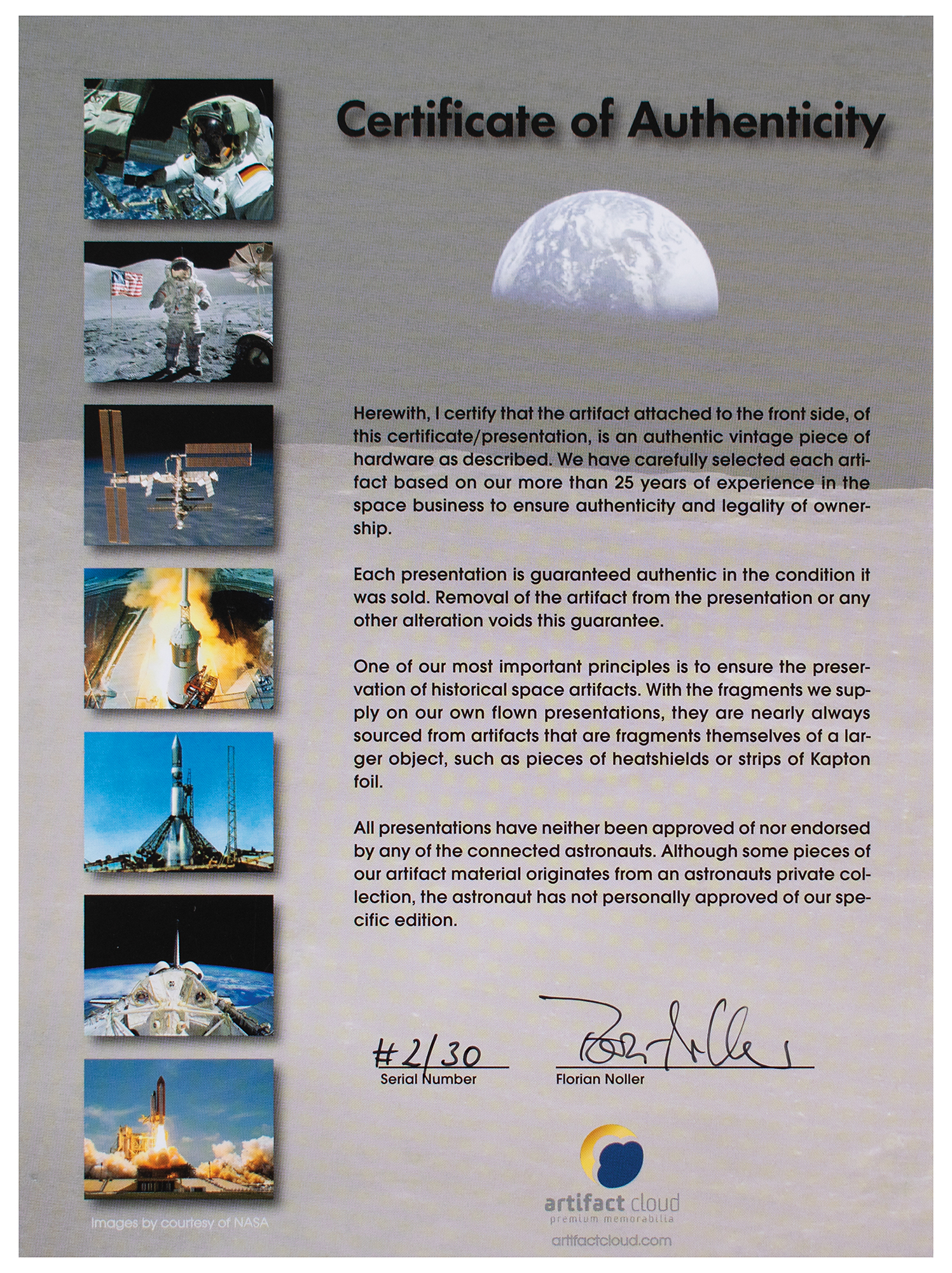 Limited edition display featuring a small swatch of film, attested to as carried on the Apollo 8 spacecraft by Florian Noller, mounted on a 6.75 x 9 foamcore presentation, numbered 2/30 on the reverse. In fine condition.