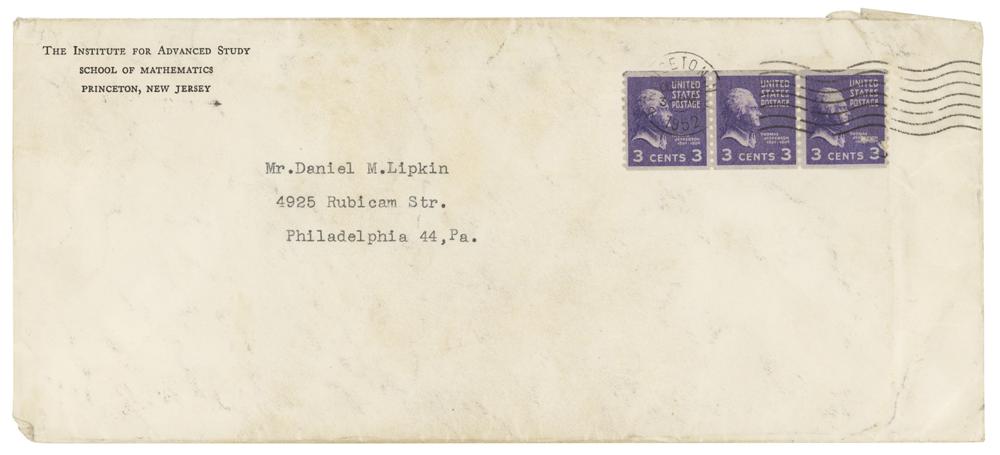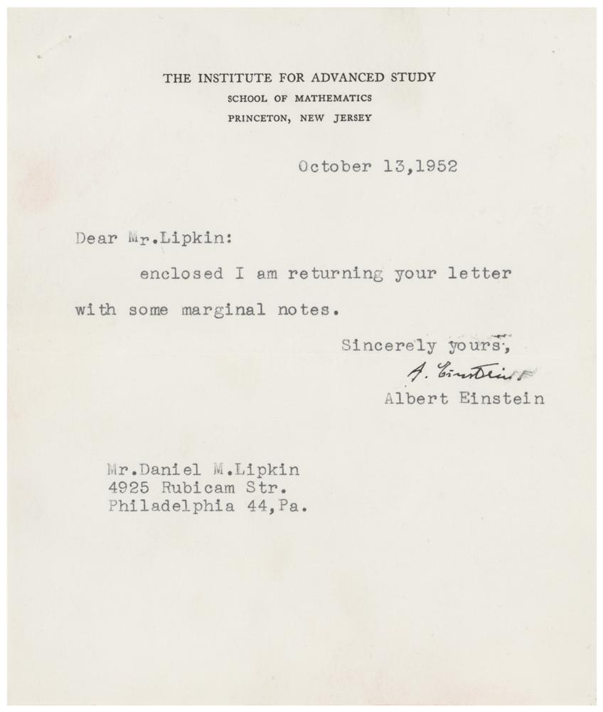 Significant archive of a five-page letter to Dr. Albert Einstein by Daniel Lipkin on the subject of space-time, copiously annotated in the margins by Einstein with autograph comments and a 9-line signed autograph statement at the end, signed "A. E."; and a TLS from Einstein to Lipkin, signed "A. Einstein," returning the letter with marginal notes on October 13, 1952.