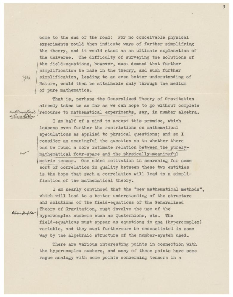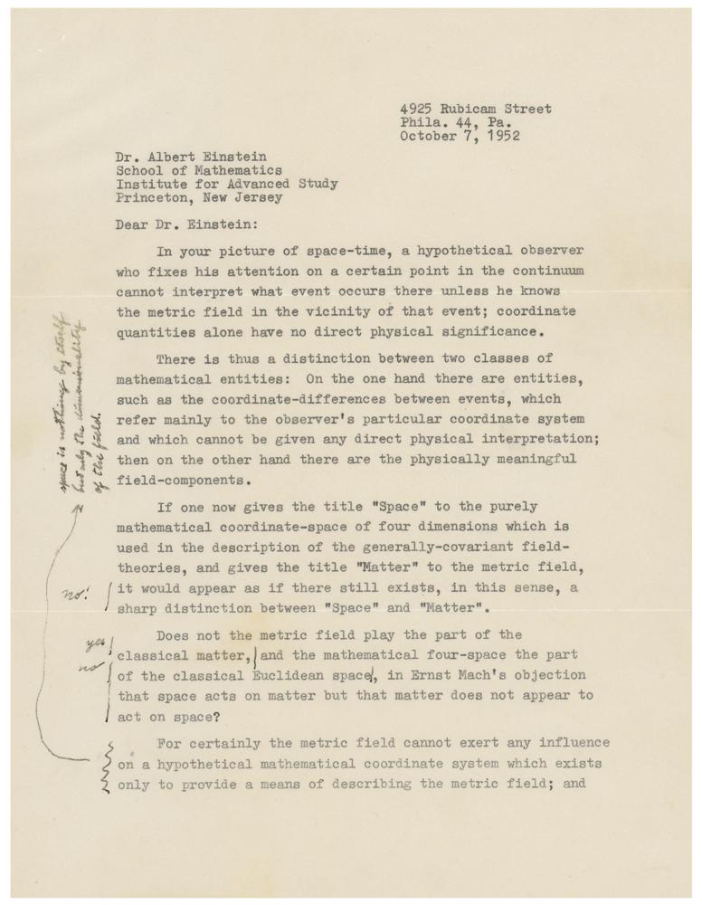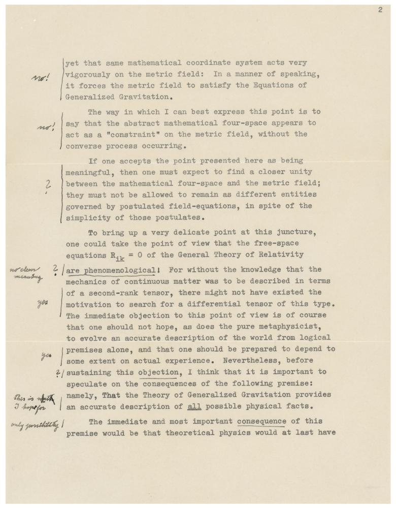 Responding like a professor reading a term paper, Einstein comments on Lipkin’s statements in the blank margins of the letter and pens his own signed summary statement at the conclusion of the text. Einstein responds with characteristic terseness to Lipkin’s statements—often simply notating “yes” or (more often) “no!” alongside them—but two of his marginal comments are highly significant in and of themselves: Einstein stating in one of them that “space is nothing by itself but only the dimensionality of the field”; and affirming “this is what I hope for” in response to Lipkin’s premising that “the Theory of Generalized Gravitation provides an accurate description of all possible physical facts.”