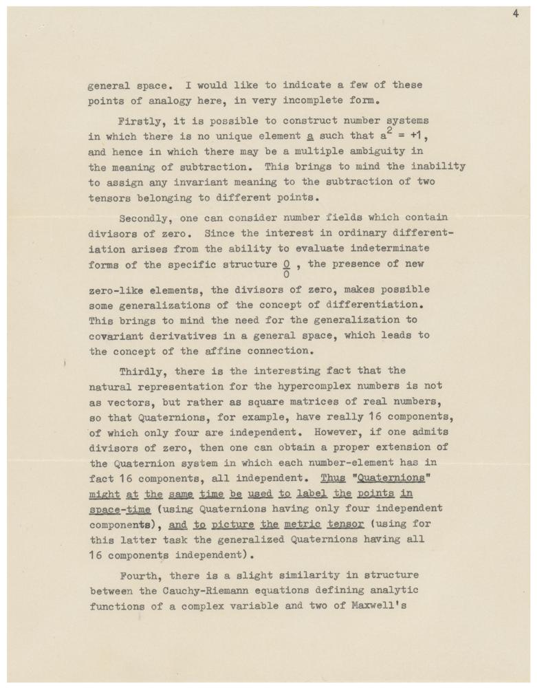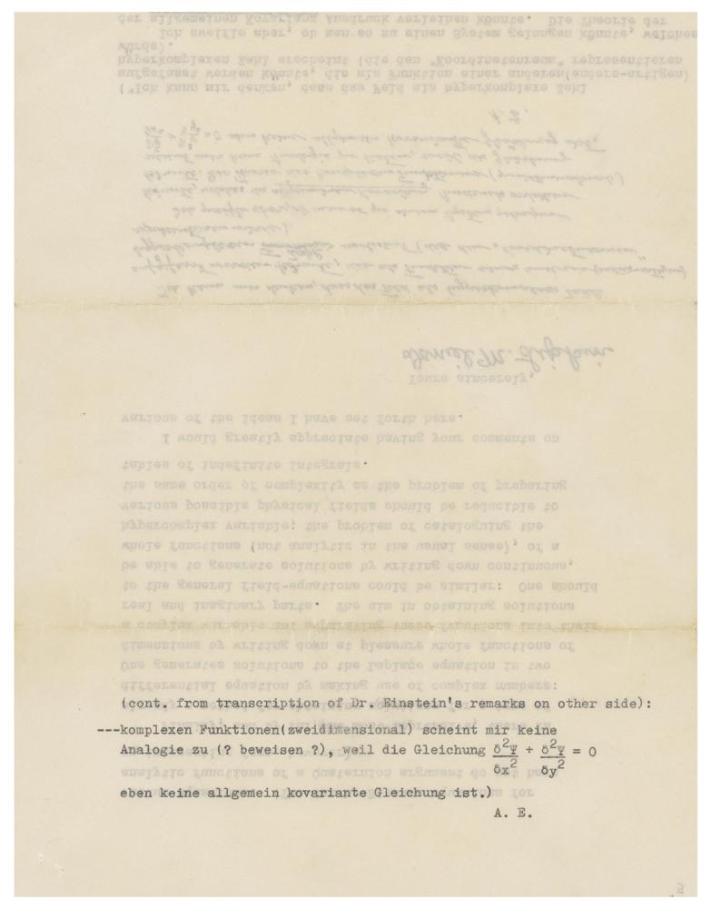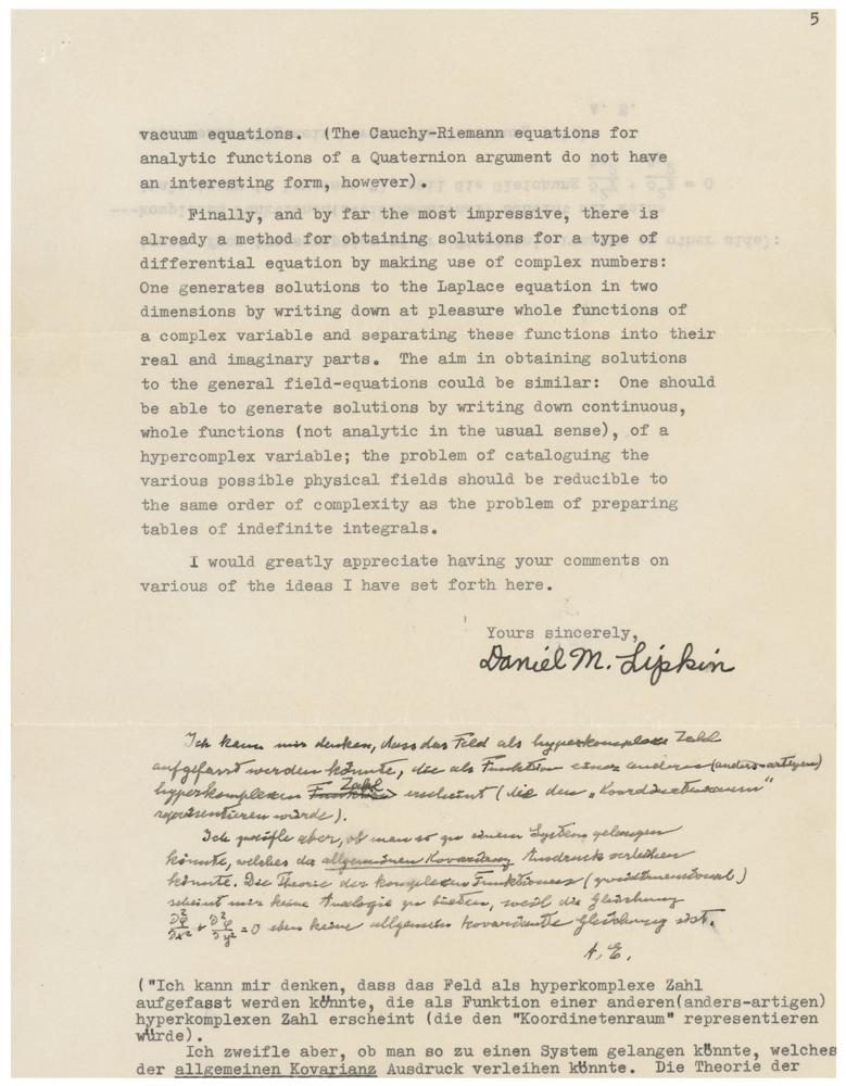 Einstein’s concluding remarks, signed "A. E.," both address the ultimate thrust of Lipkin’s letter and are of import for the future direction of Einstein’s own research efforts (translated): "I can imagine that the [metric] field could be understood as a hyper-complex number, which appears as a function of another (different) hyper-complex number (which would represent the "coordinate space"). But I wonder whether it would be possible to arrive at a system that could give expression to the general covariance. The theory of complex functions (two-dimensional) does not seem to me to offer any analogy, because [equation] is not a general covariant equation." In overall fine condition.