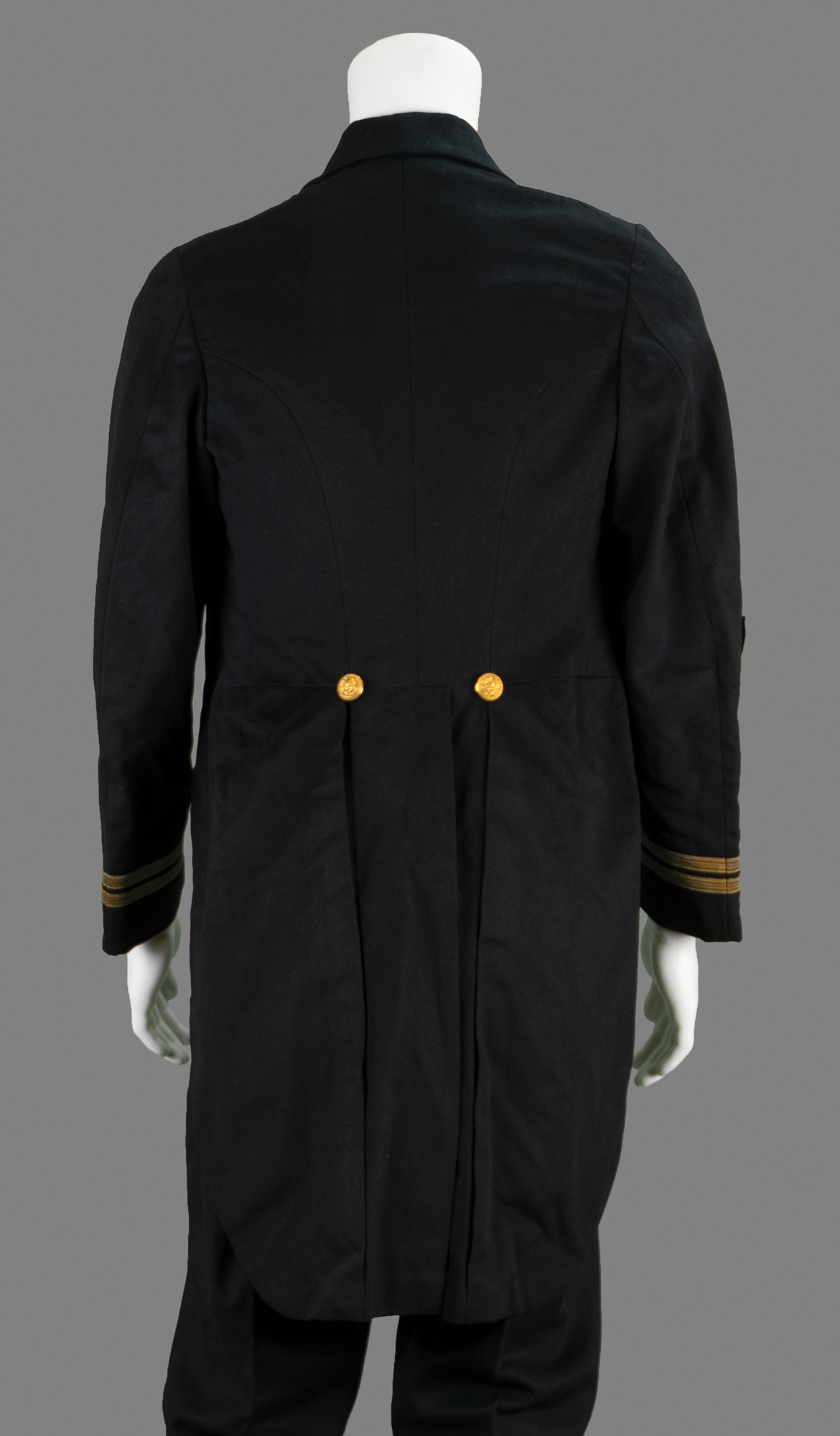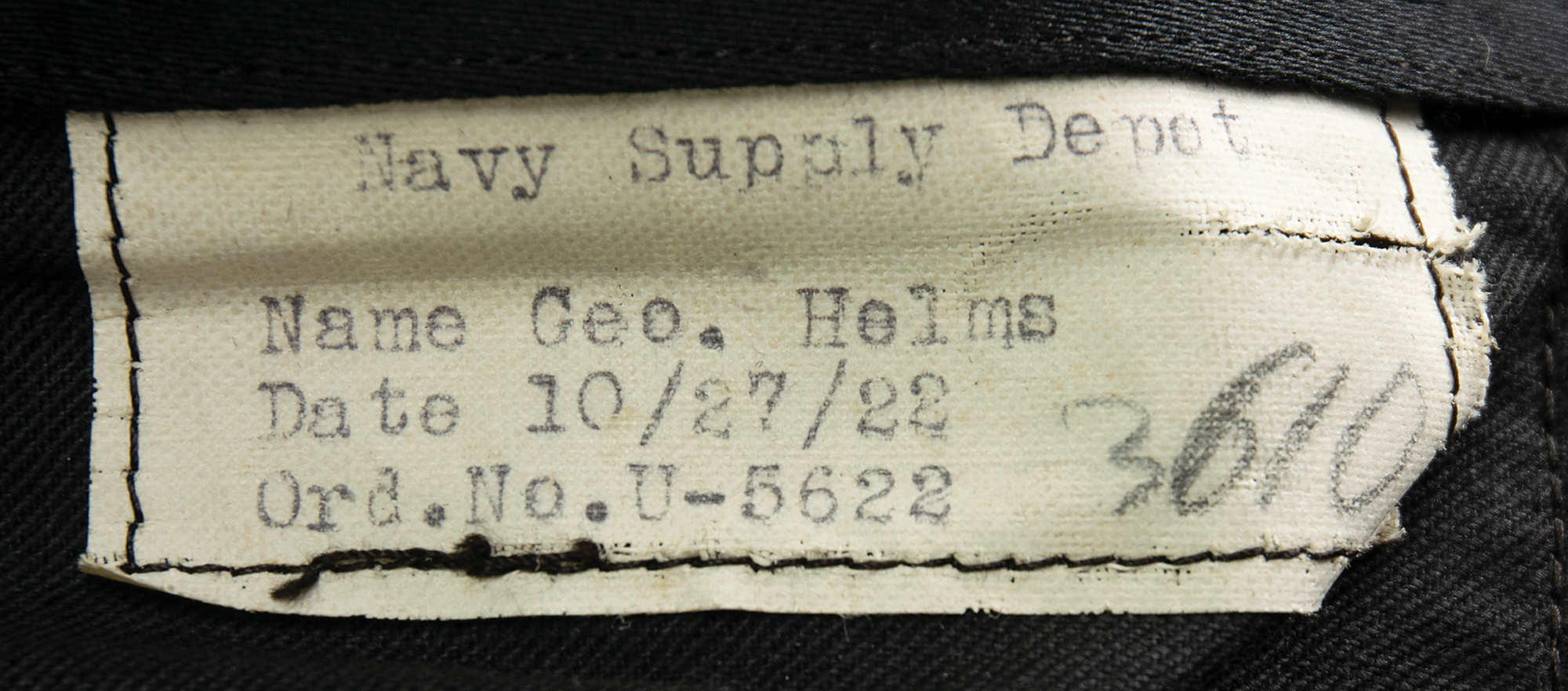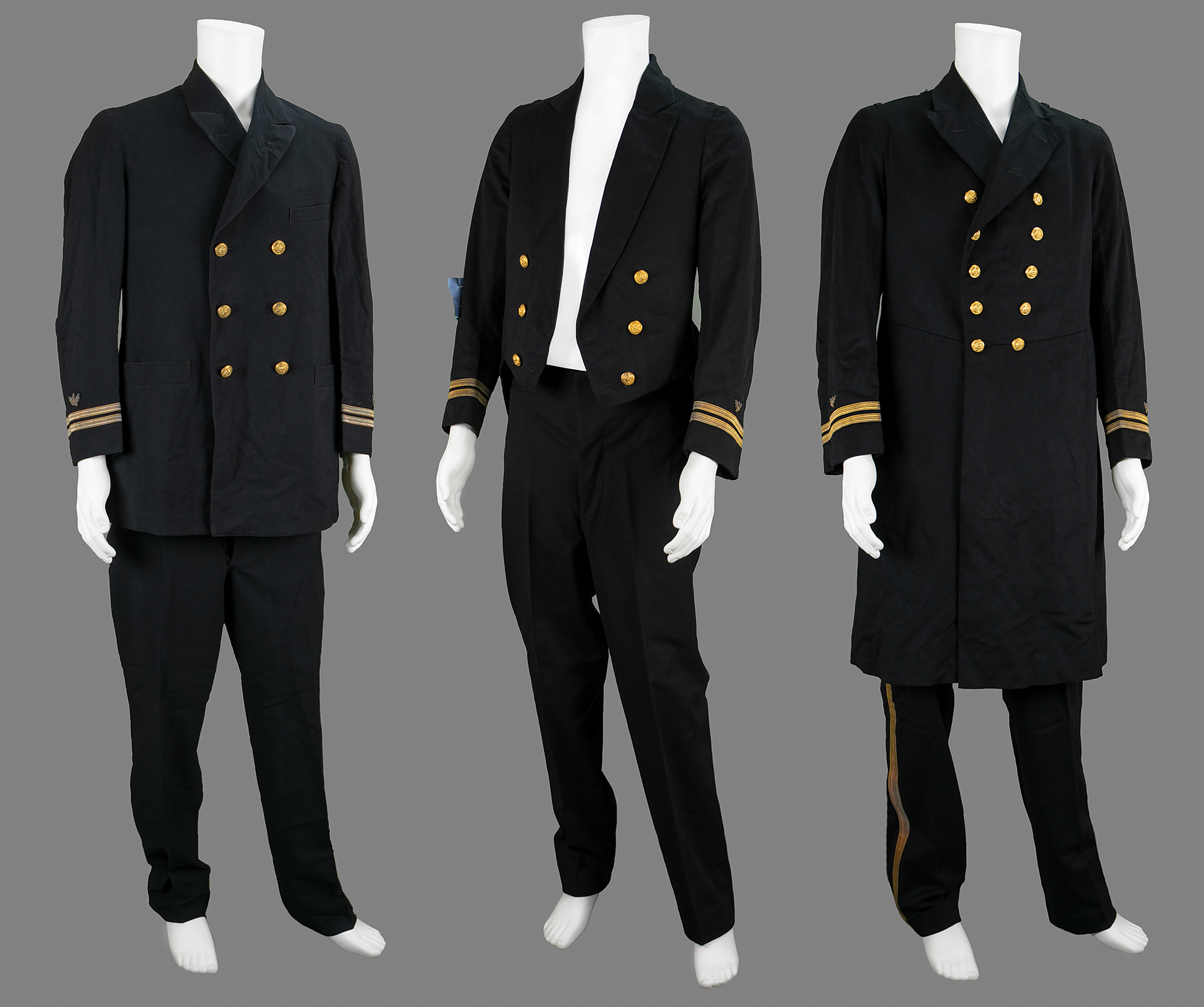 — An impressive set of three dark-blue U.S. Navy dress coats with matching trousers; one coat bears the original Officer’s Uniform Shop tag, issued to “Geo. Helms,” dated August 14, 1922, and one pair of trousers features an inner Navy Supply Depot label, issued to “Geo. Helms,” and dated October 27, 1922.