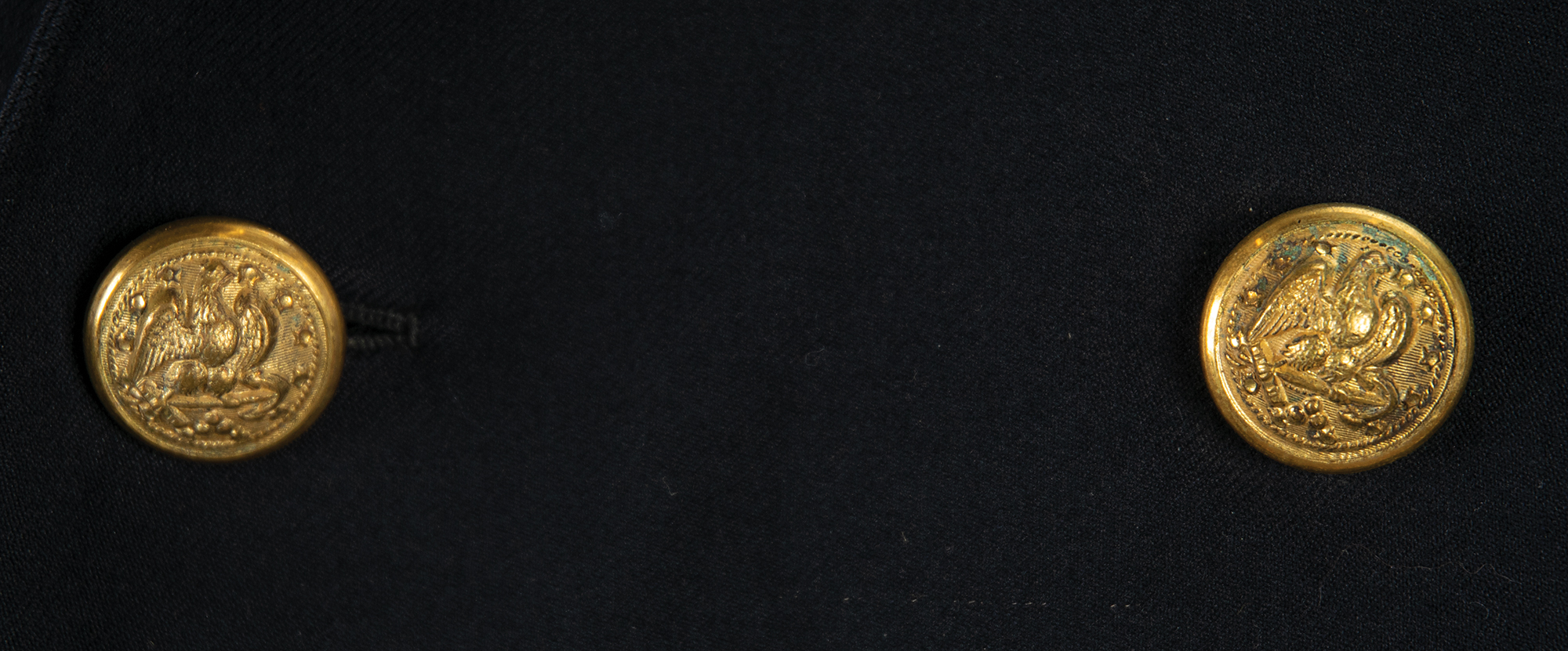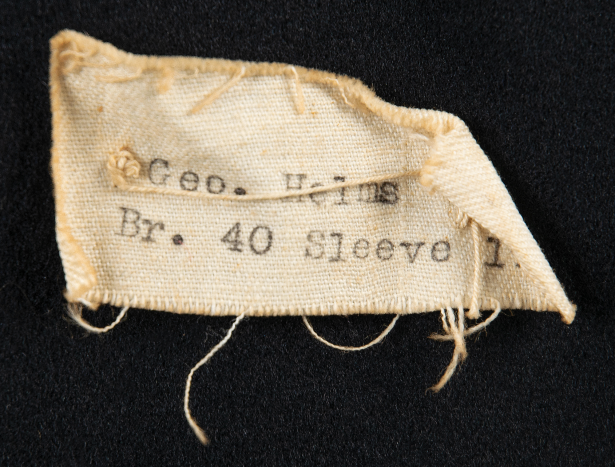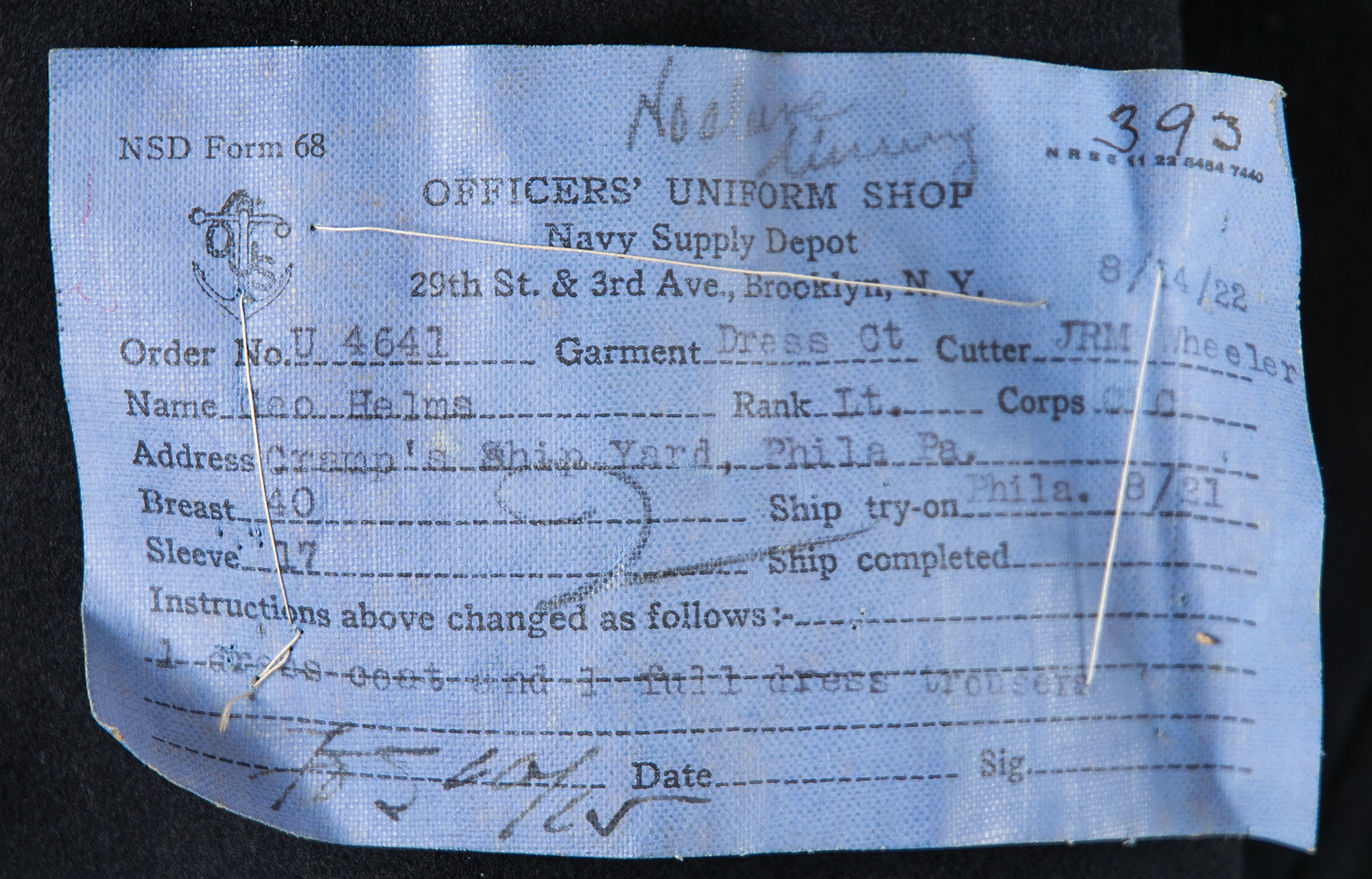 — An impressive set of three dark-blue U.S. Navy dress coats with matching trousers; one coat bears the original Officer’s Uniform Shop tag, issued to “Geo. Helms,” dated August 14, 1922, and one pair of trousers features an inner Navy Supply Depot label, issued to “Geo. Helms,” and dated October 27, 1922.