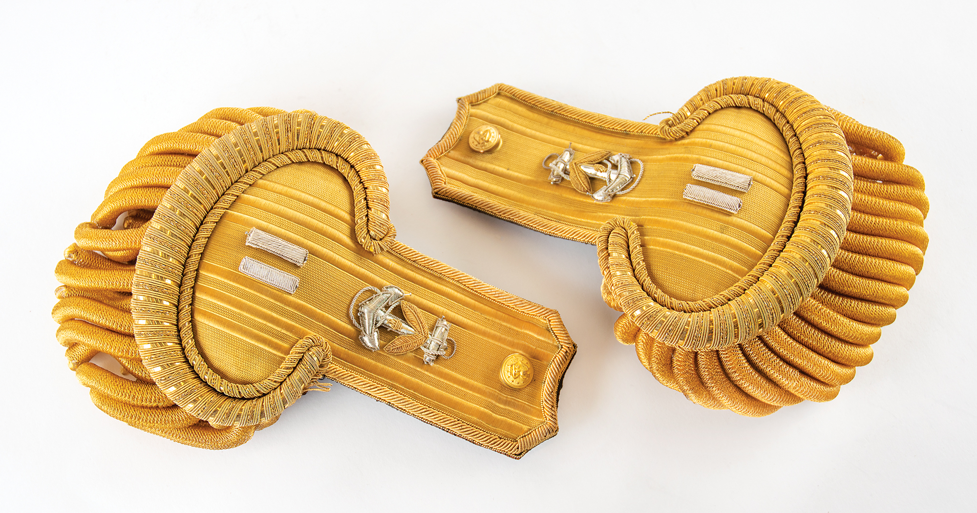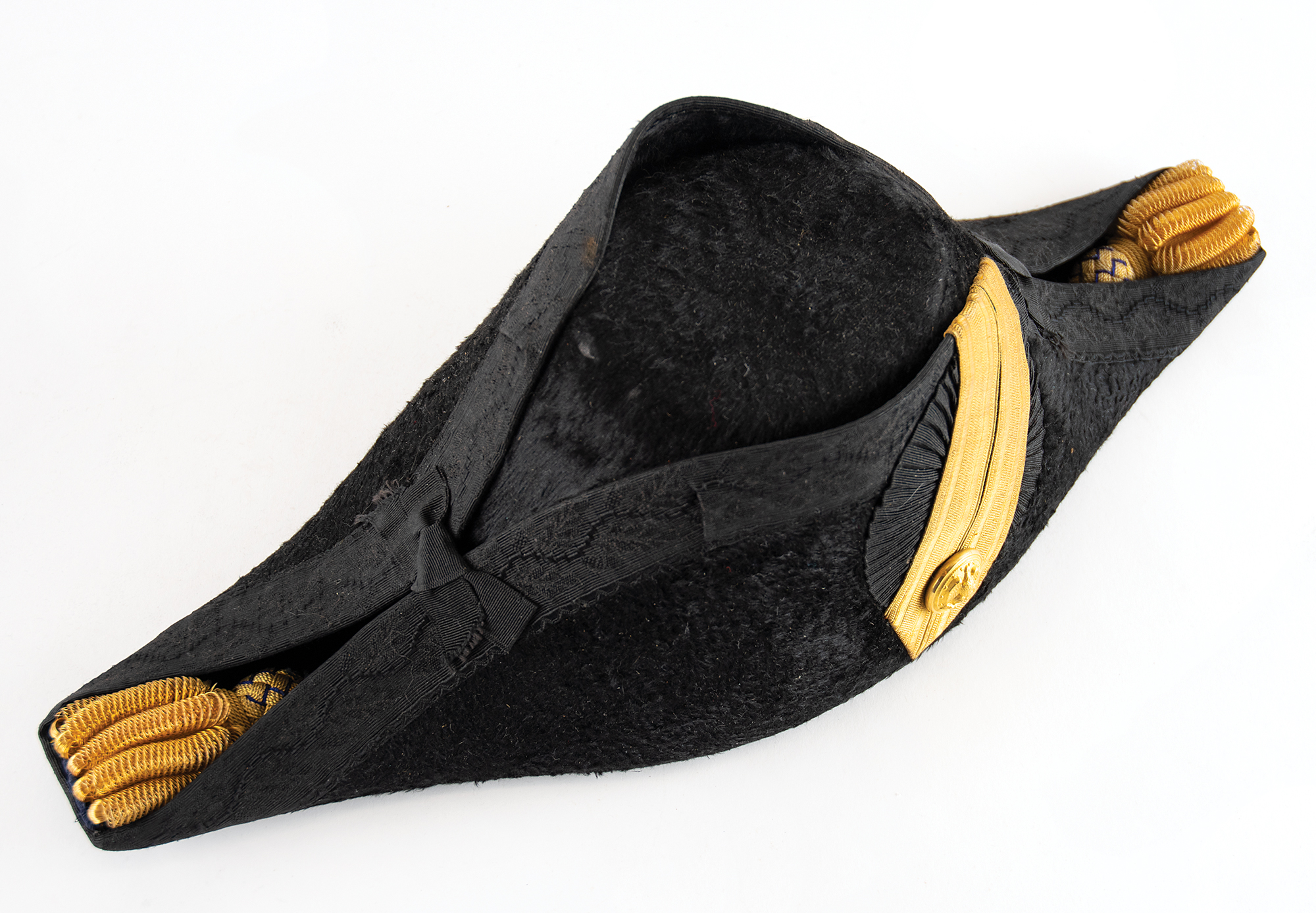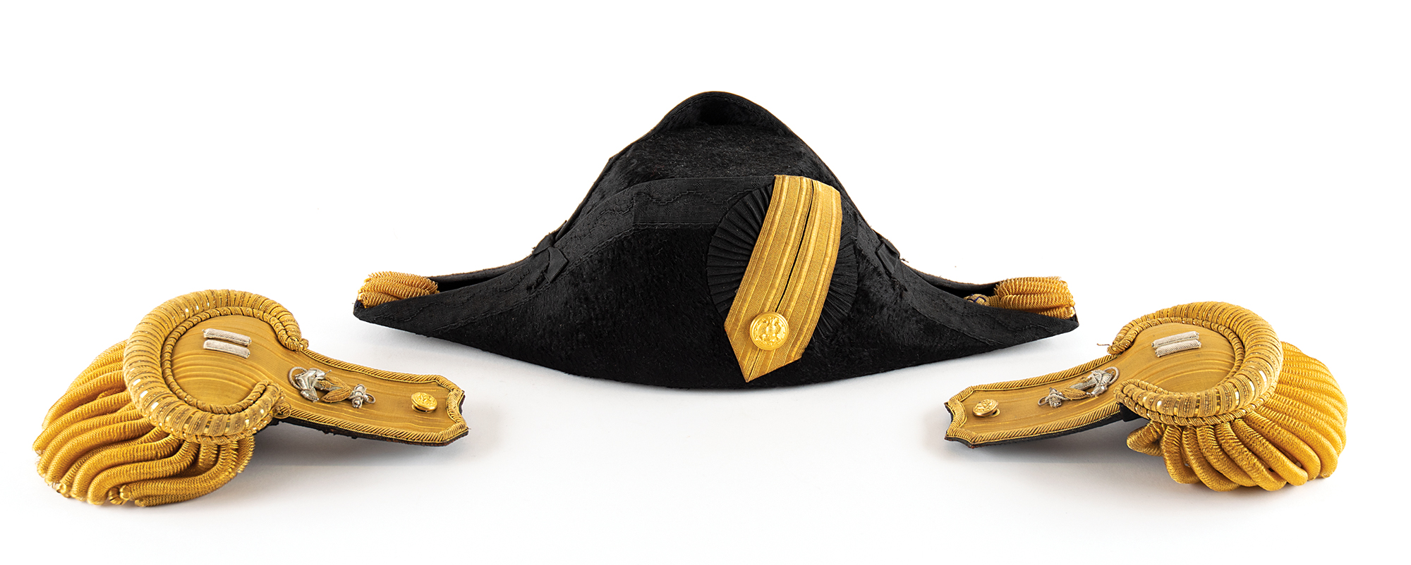 — A high-quality pair of French-made epaulettes with gold bullion fringe, Naval button, anchor, and lieutenant insignia bars, and a black sealskin fore and aft hat, or cocked hat, with gold bullion tassels; these are housed in their original black tin carrying case, 18.5 x 7 x 8.