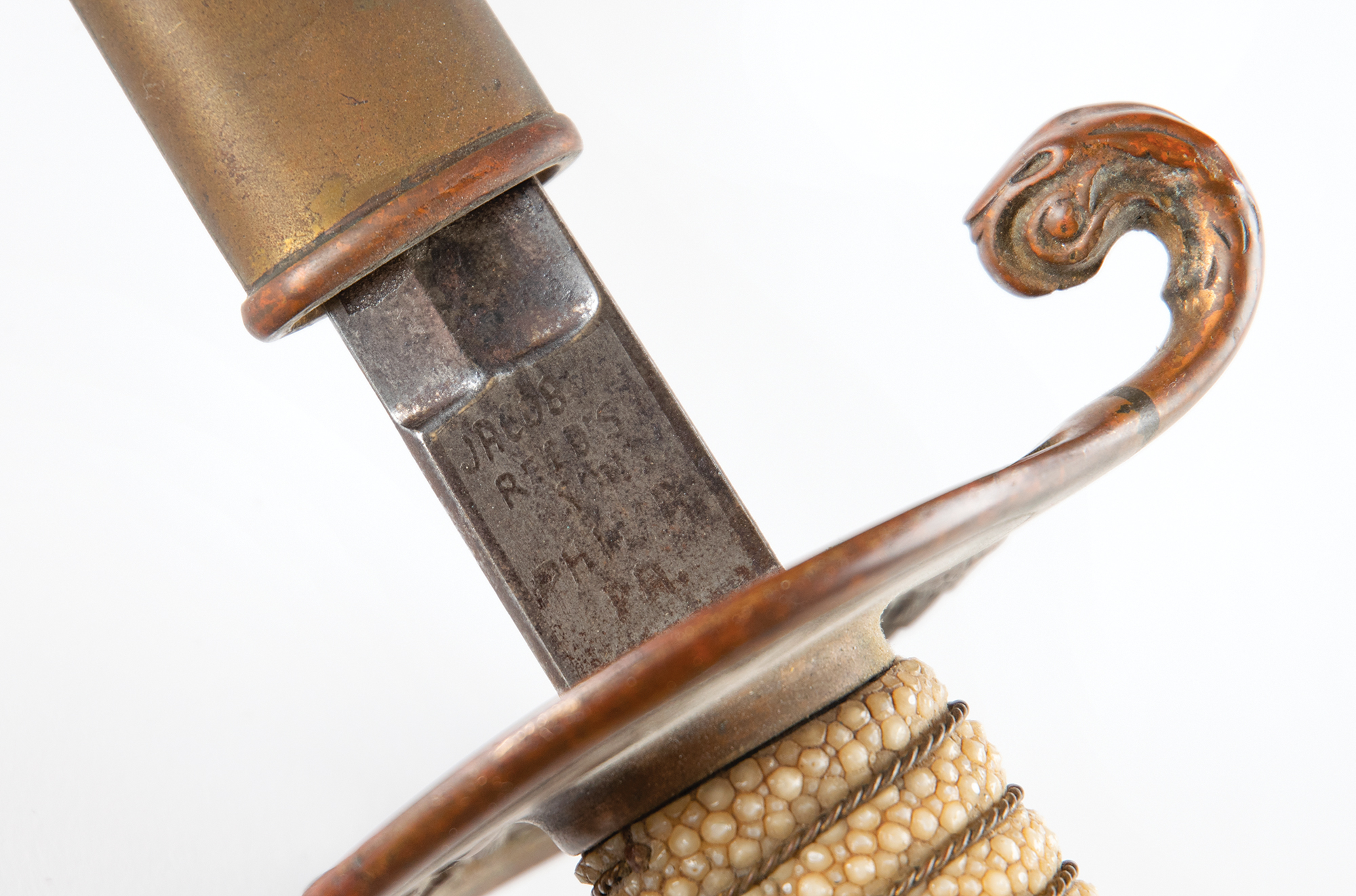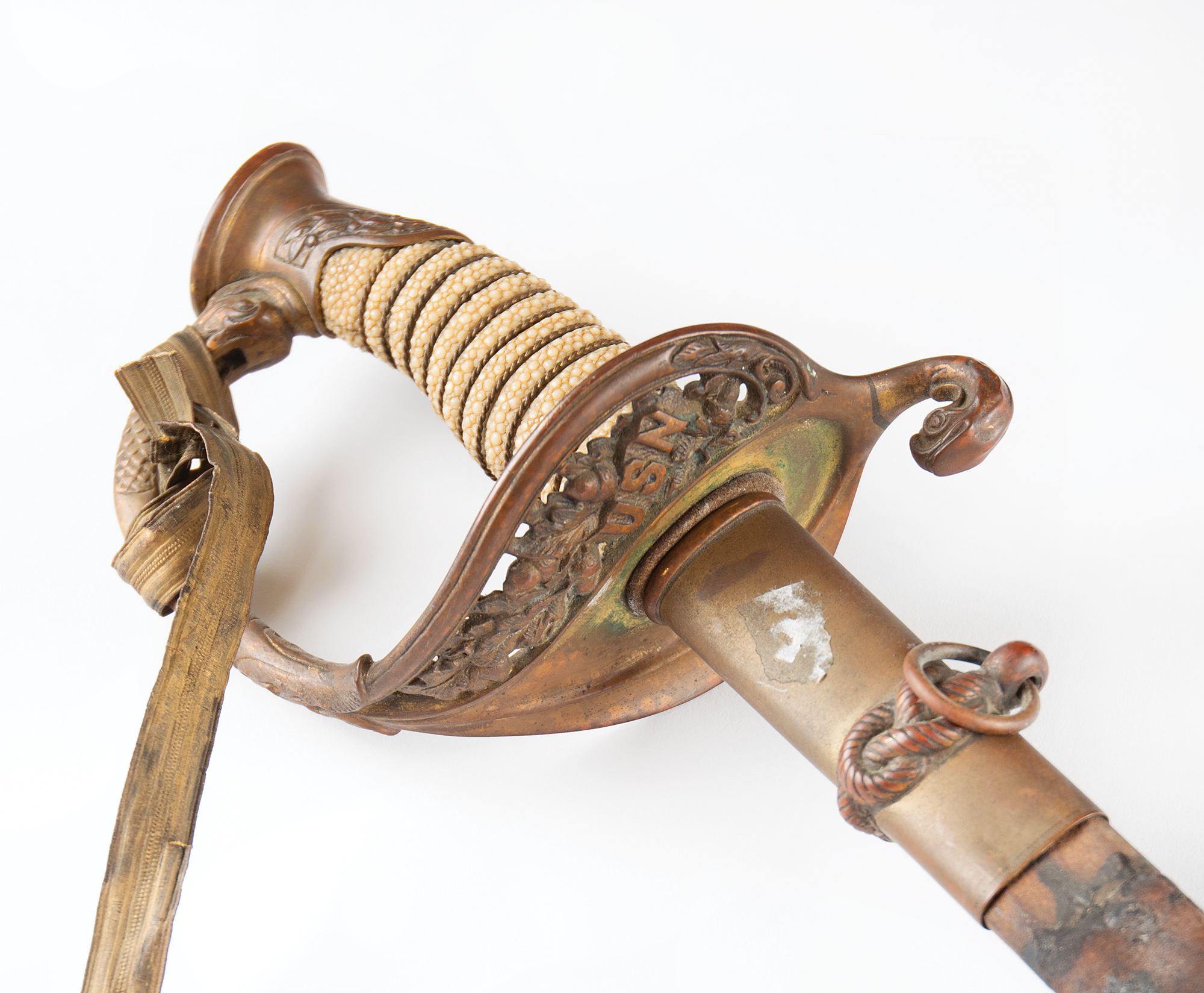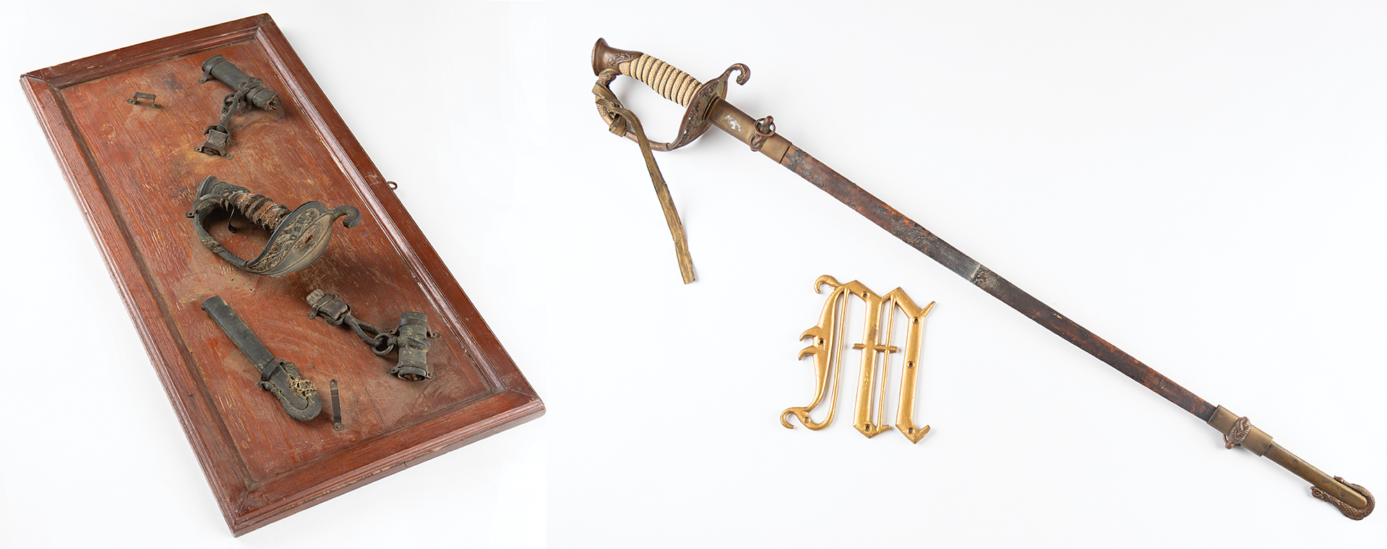 — Rusted fragments of Helms' naval sword removed from the USS Maine when it was raised in 1911; these fragments are mounted to a display board measuring 24″ x 12″. Includes his United States Navy dress sword, by Jacob Reed’s Sons of Philadelphia, with original scabbard, which exhibits loose mounts and dry leather.