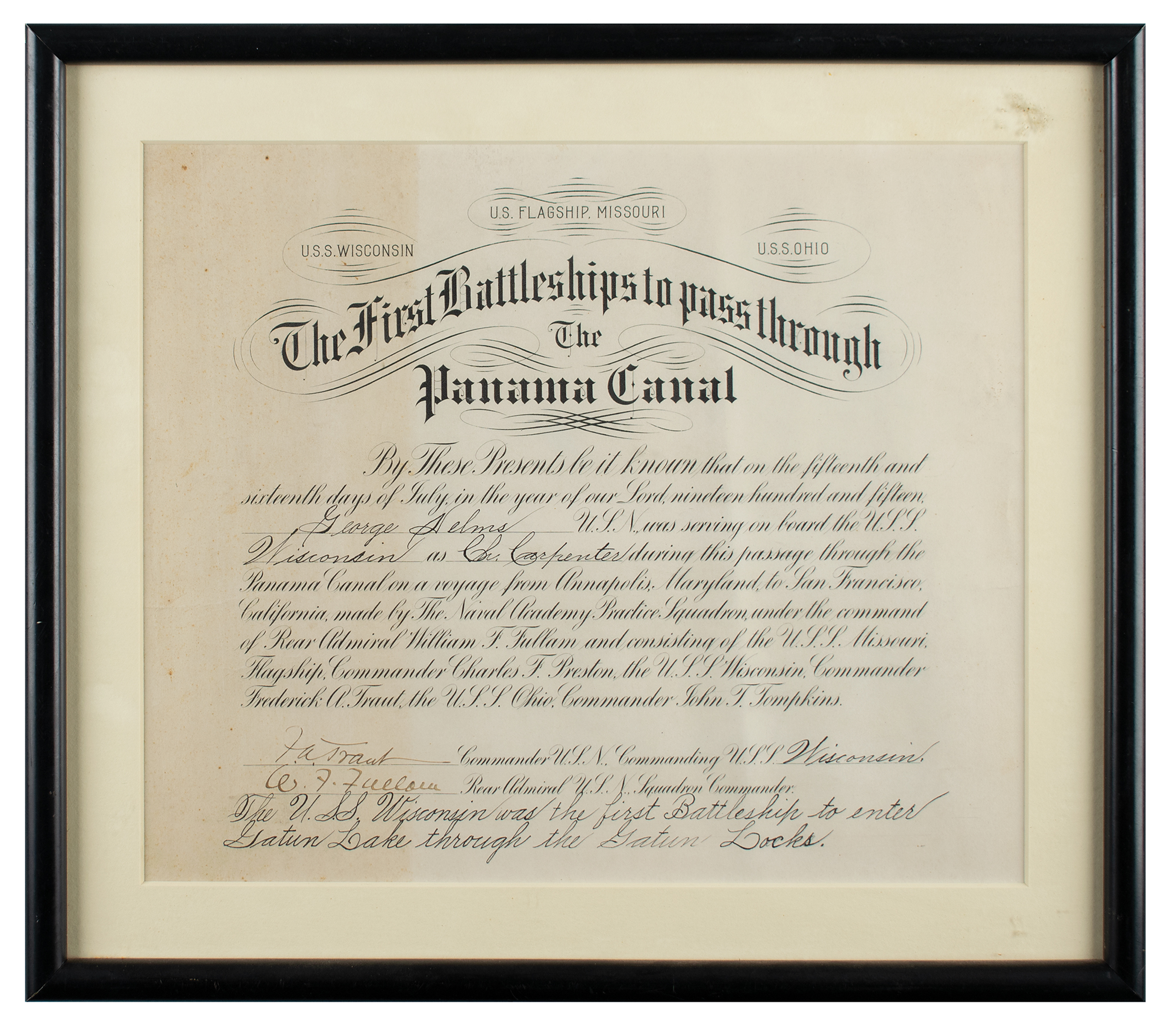 — U.S. Navy certificate, 12 x 10, presented to Helms as “Ch. Carpenter” of the USS Wisconsin, one of “The First Battleships to pass through The Panama Canal,” on July 15 and 16, 1915. Signed at the conclusion by Rear Admiral William Fullam. Framed.