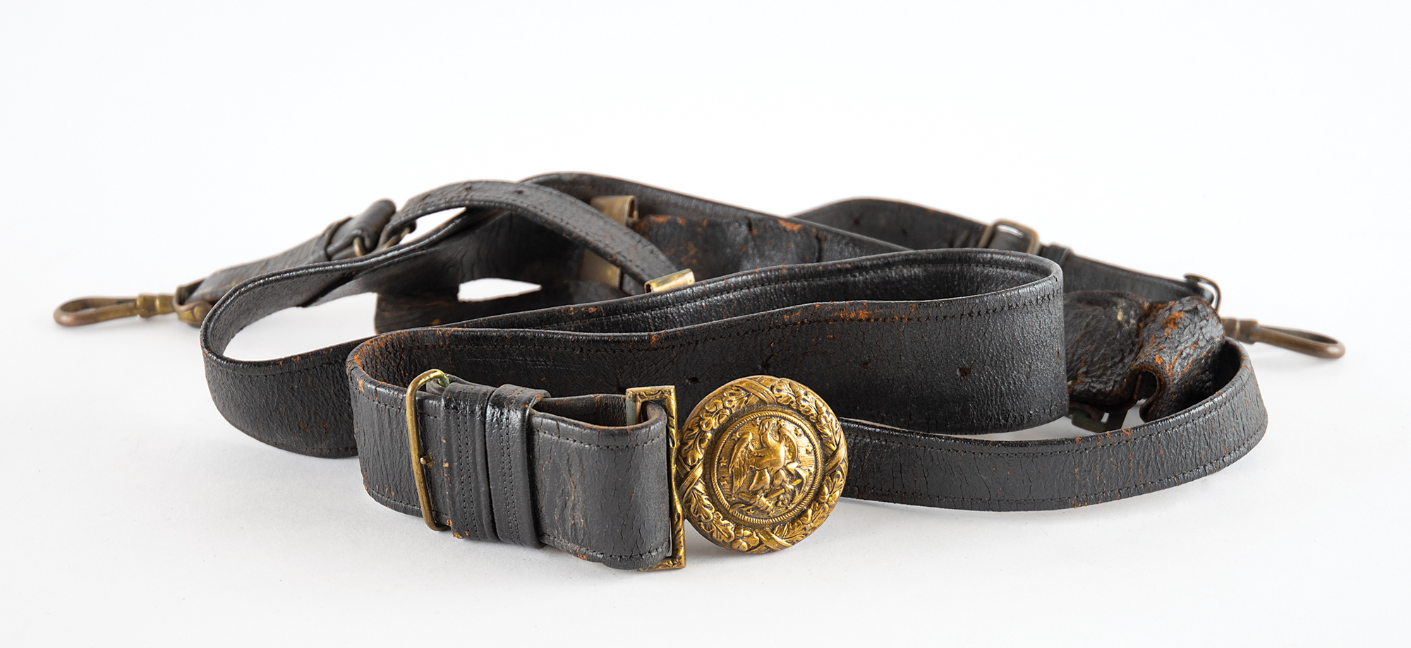 — A U.S. Navy officer's belt rig, approximately 40″ in length, which exhibits some dryness and flaking to leather.