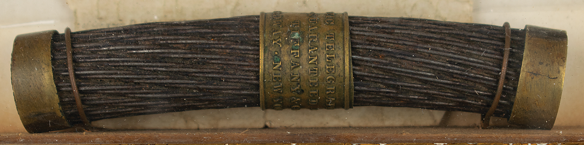 Segment of the first transatlantic telegraph cable from 1858, measuring 3.5″ long, made into a souvenir and sold by Tiffany & Co. The cable is wrapped with a brass band, reading: "Atlantic Telegraph Cable, Guaranteed by Tiffany & Co., Broadway, New York, 1858." Accompanied by a worn facsimile letter by Cyrus W. Field, in part: "This is to certify that I have sold the balance of the Atlantic Telegraph Cable now on board of the U.S.S.V. Niagara to Messrs. Tiffany & Co…the piece which accompanied this, is a genuine section thereof." Mounted and framed together in a shadowbox to an overall size of 11.75 x 13.75.
