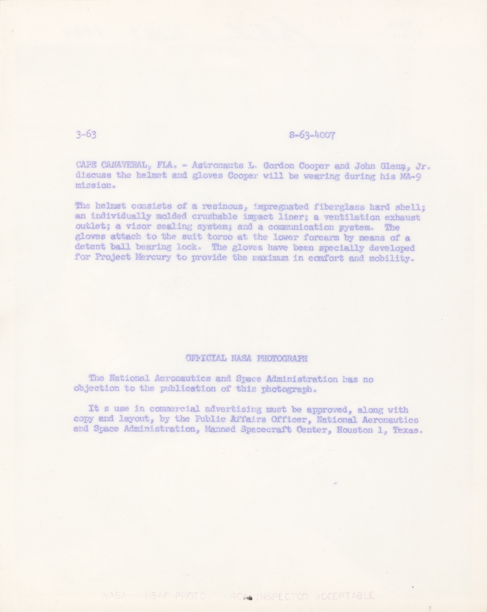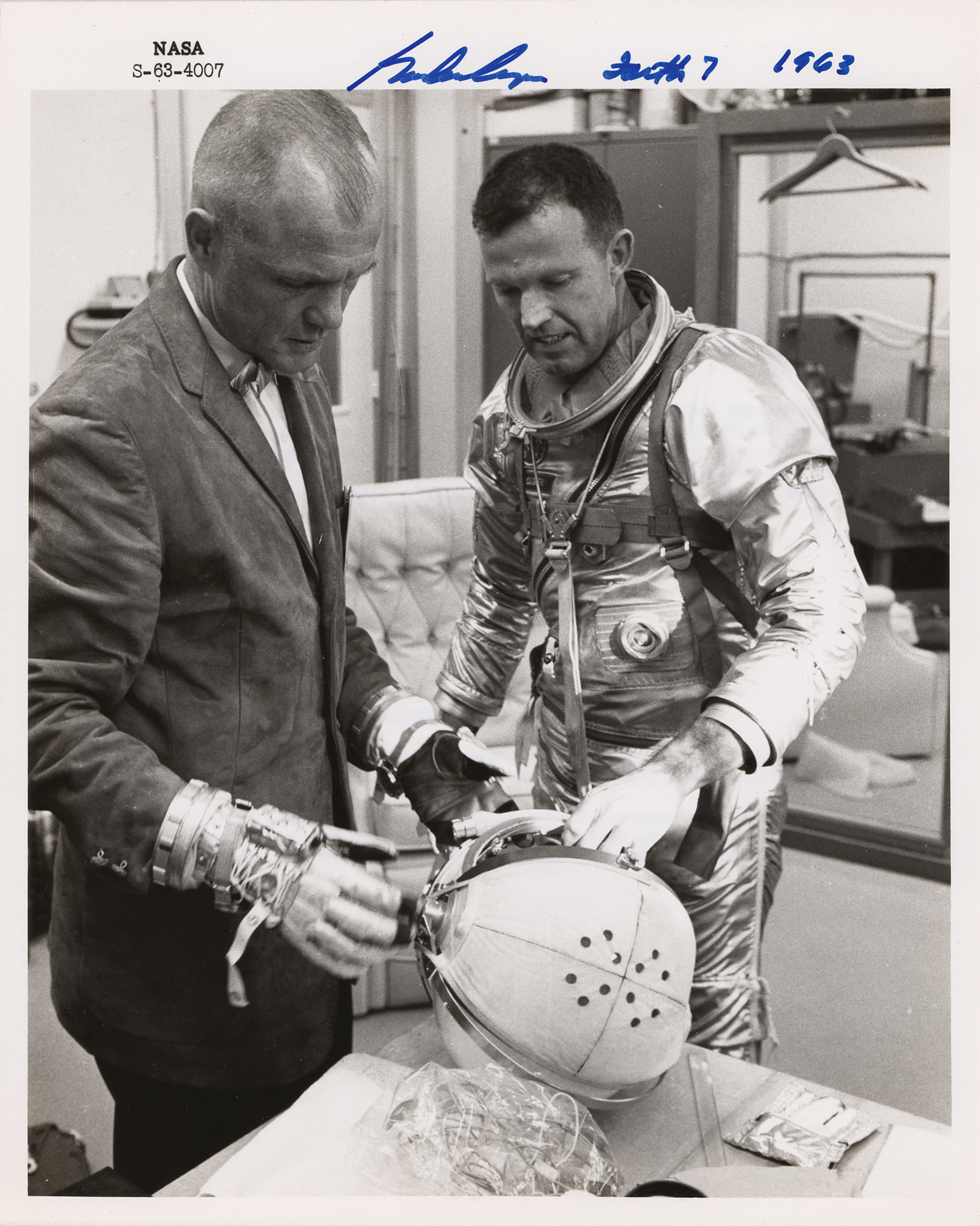 Official glossy 8 x 10 numbered NASA photo (S-63-4007) of Gordon Cooper and John Glenn discussing the helmet and gloves that Cooper will be wearing during his MA-9 mission, signed in the upper border in blue felt tip, “Gordon Cooper, Faith 7, 1963.” Reverse bears purple NASA caption text and a faint NASA-USAF photo stamp. In fine condition.