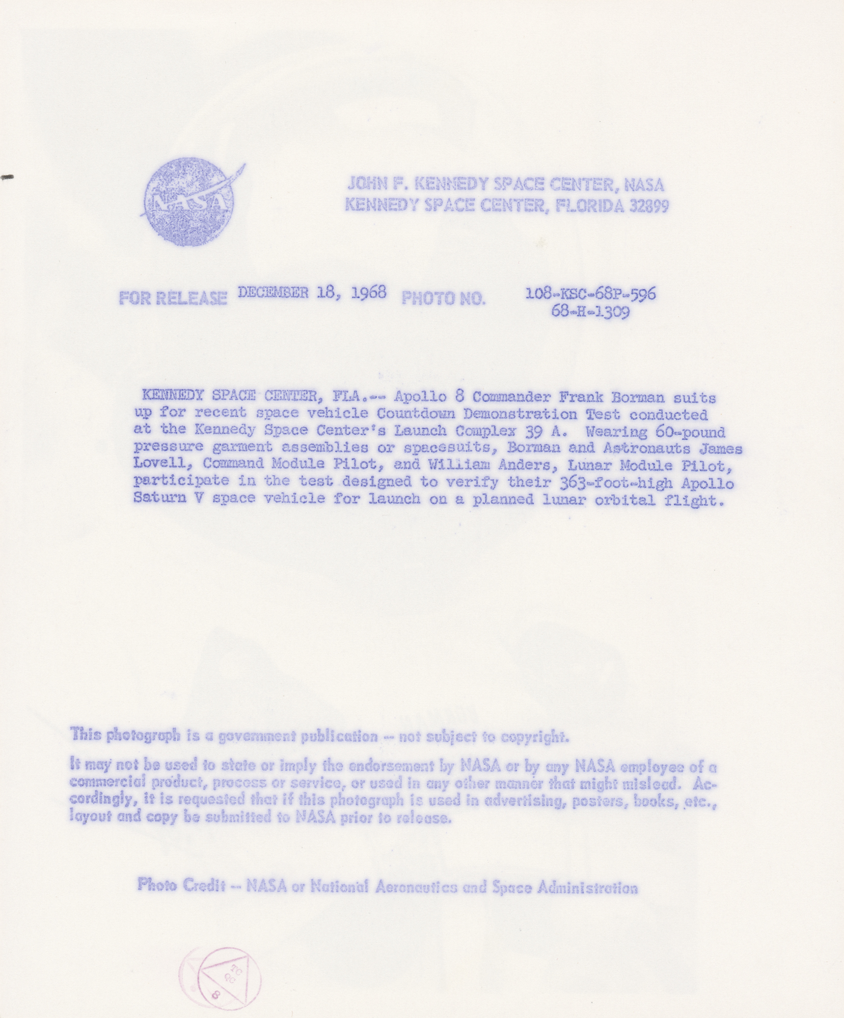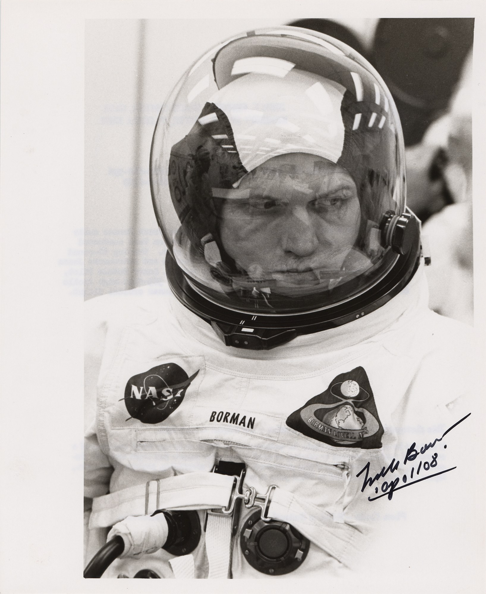 Official glossy 8 x 10 NASA photo of Frank Borman wearing his Apollo 8 space suit before a space vehicle Countdown Demonstration Test conducted at Launch Complex 39 A, signed in black felt tip, "Frank Borman, 'Apollo 8.'" Reverse bears purple NASA caption text. In fine condition, with light silvering to the darker areas of the image, and light show-through from the NASA caption on the back.