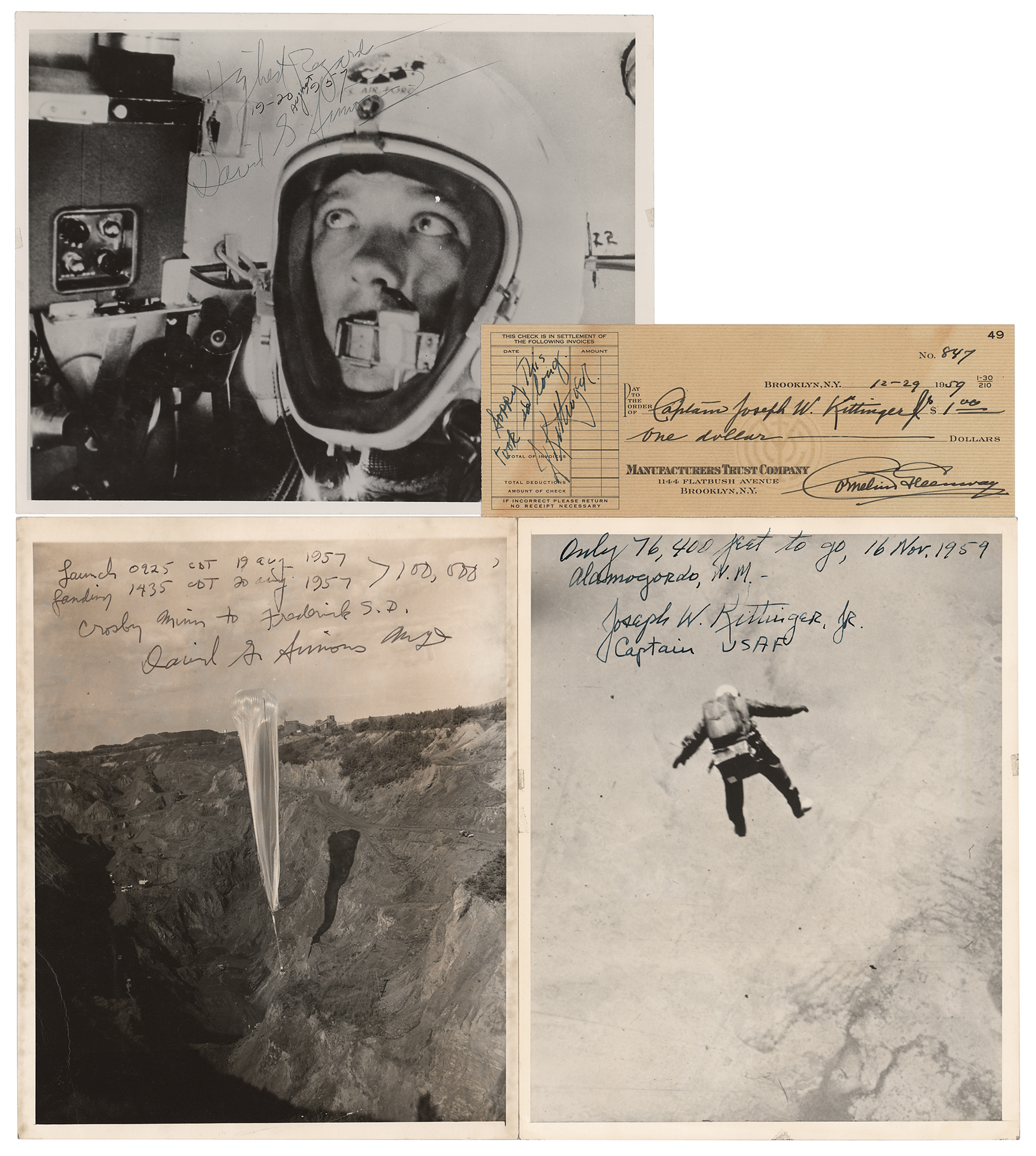 Four items signed by noted Project Manhigh and Excelsior participants Joseph Kittinger and David G. Simons, including: a matte-finish 8 x 10 photo of Kittinger falling through the sky, signed in fountain pen, “Only 76,400 feet to go, 16 Nov. 1959, Alamogordo, N. M.—Joseph W. Kittinger, Jr., Captain USAF”; a bank check from noted collector Cornelius Greenway, made payable to Captain Joseph W. Kittinger, Jr., for $1, December 29, 1959, signed on the left side in fountain pen, “Sorry this took so long. J. Kittinger”; a glossy 10 x 8 close-up photo of Simons, wide-eyed inside his capsule, signed in black ballpoint, “Highest regards, David G. Simons,” with another hand adding a date of August 19-20, 1957; and matte-finish 8 x 10 photo of the helium balloon that lifted Simons and his capsule 19 miles above the Earth, signed in fountain pen, “Launch 0925 CDT 19 Aug 1957, Landing 1435 CDT 20 Aug 1957 > 100,000´, Crosby Minn to Frederick S.D., David G. Simons, Major.” In overall very good to fine condition, with some creasing to the Simons photos.