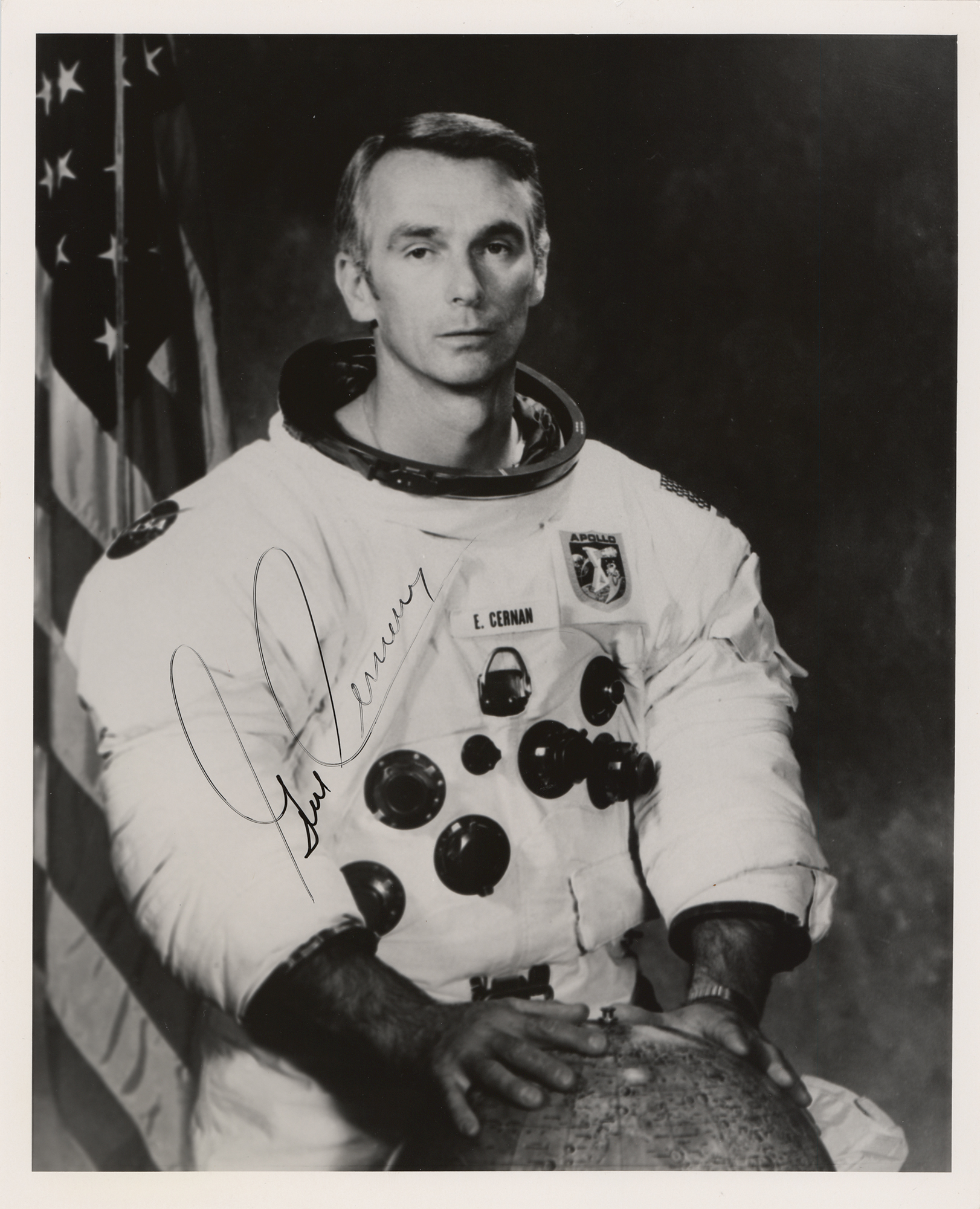 Glossy 8 x 10 photo of Gene Cernan wearing his Apollo 10 space suit and holding a lunar globe, signed in black felt tip. In fine condition.