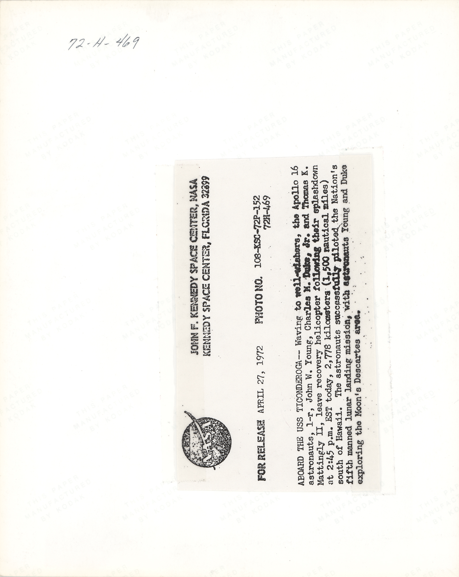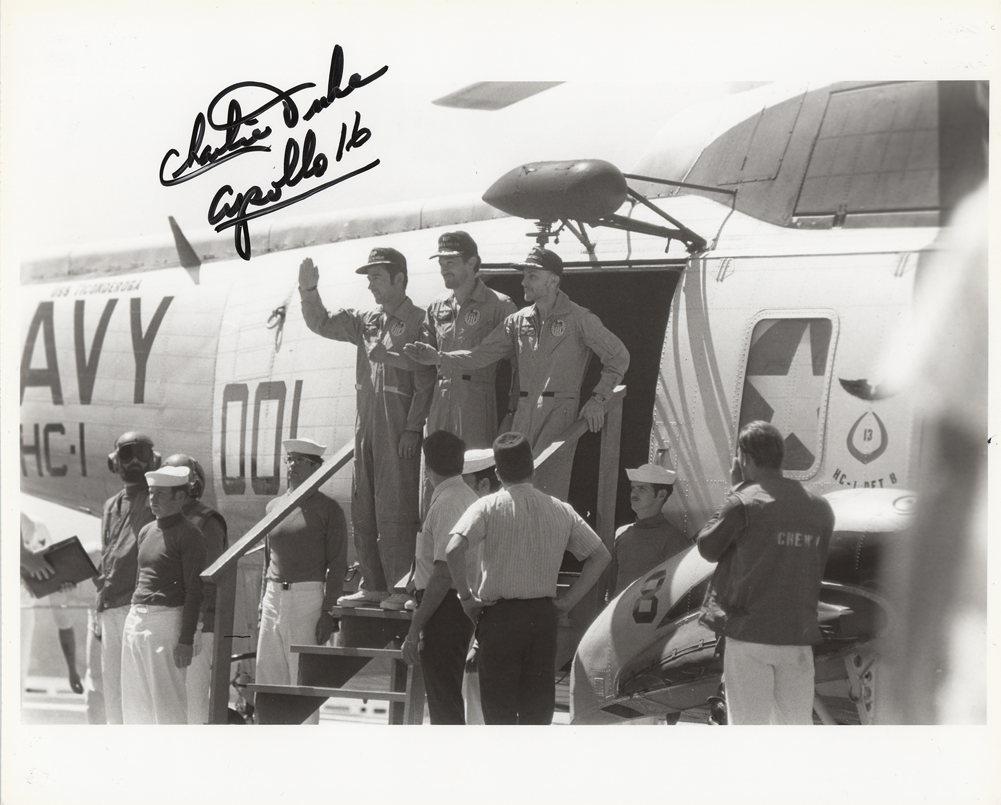 Official glossy 10 x 8 NASA photo of the Apollo 16 crew following their successful splashdown, signed in black felt tip, "Charlie Duke, Apollo 16." Reverse bears "This Paper Manufactured by Kodak" watermarks and an affixed NASA caption. In fine condition.