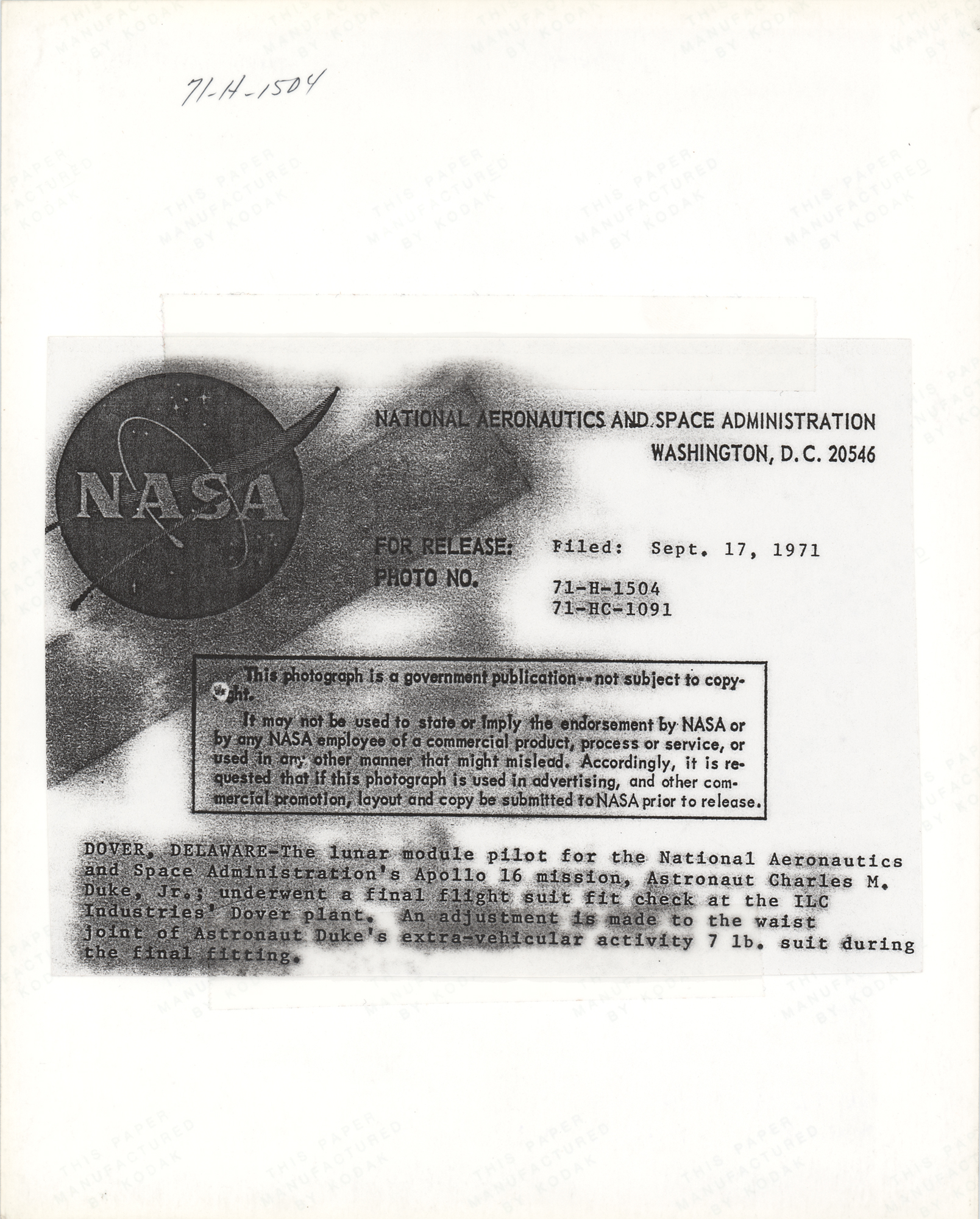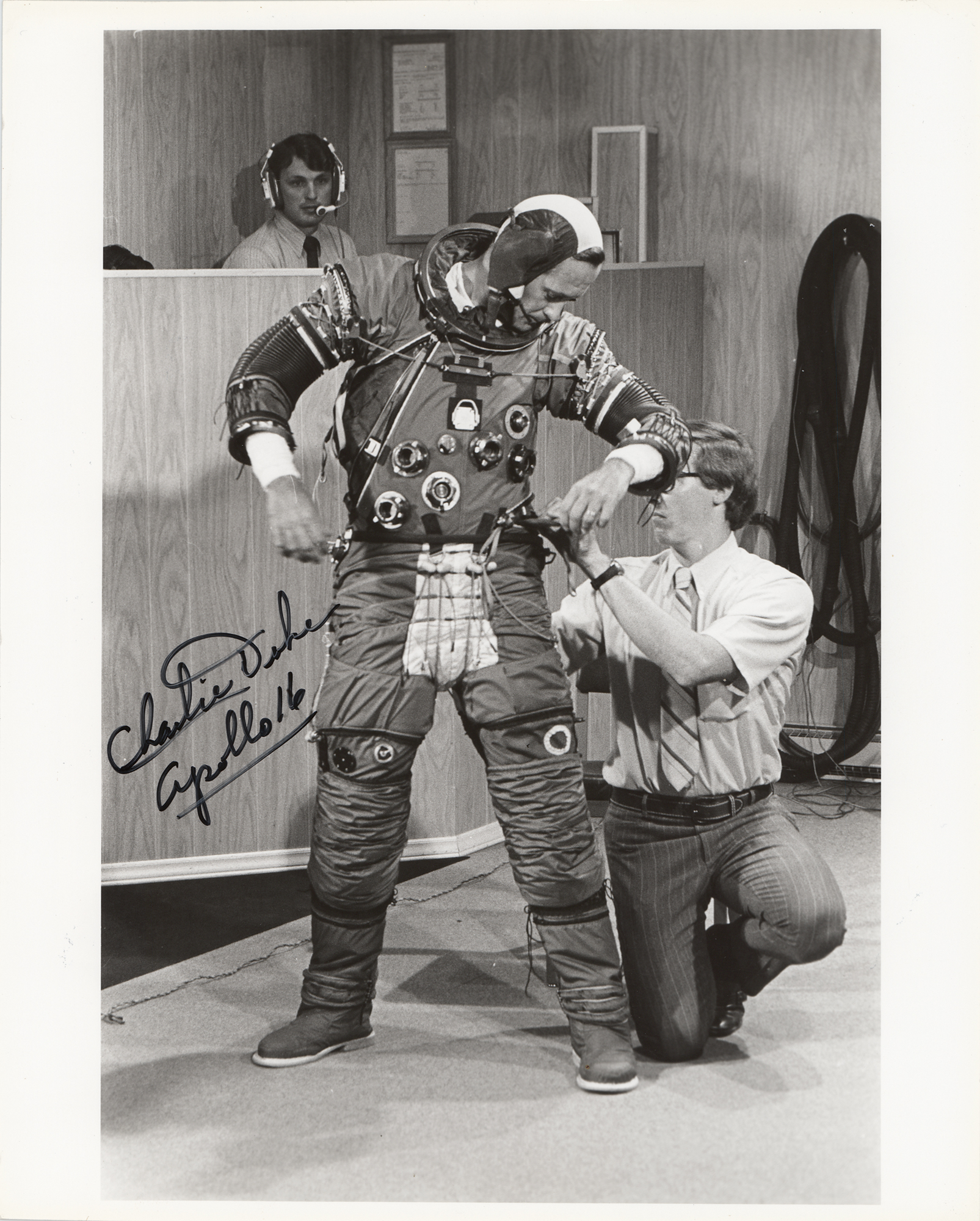 Official glossy 8 x 10 NASA photo of Charlie Duke undergoing a final flight suit fit check at the ILC Industries Dover plant, signed in black felt tip, "Charlie Duke, Apollo 16." Reverse bears "This Paper Manufactured by Kodak" watermarks and an affixed NASA caption. In fine condition.