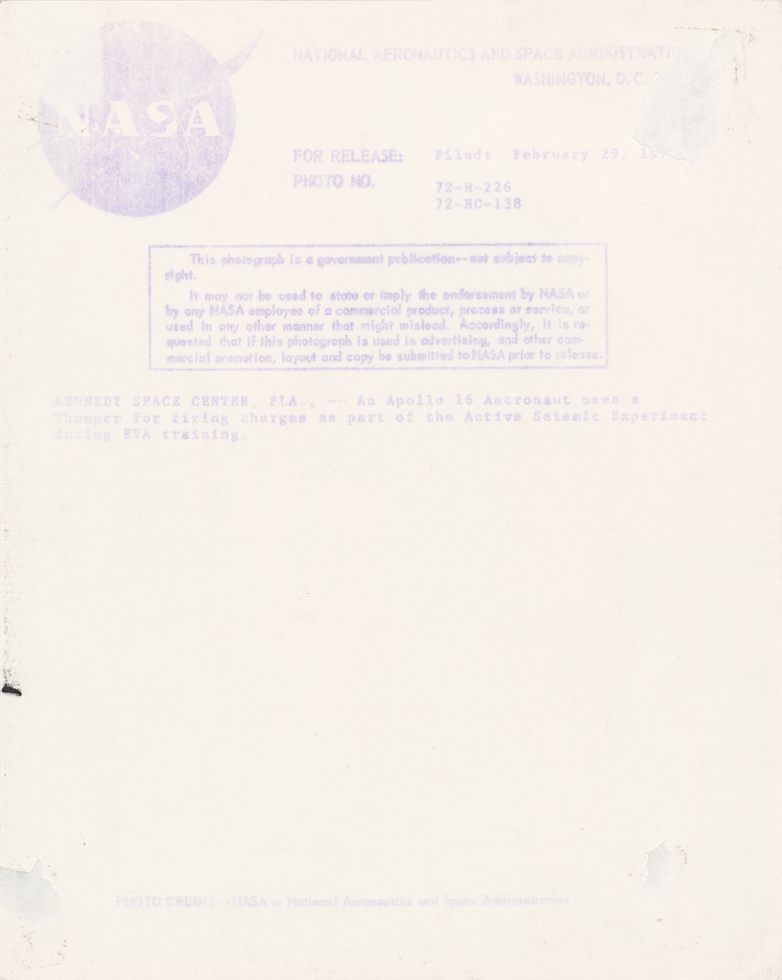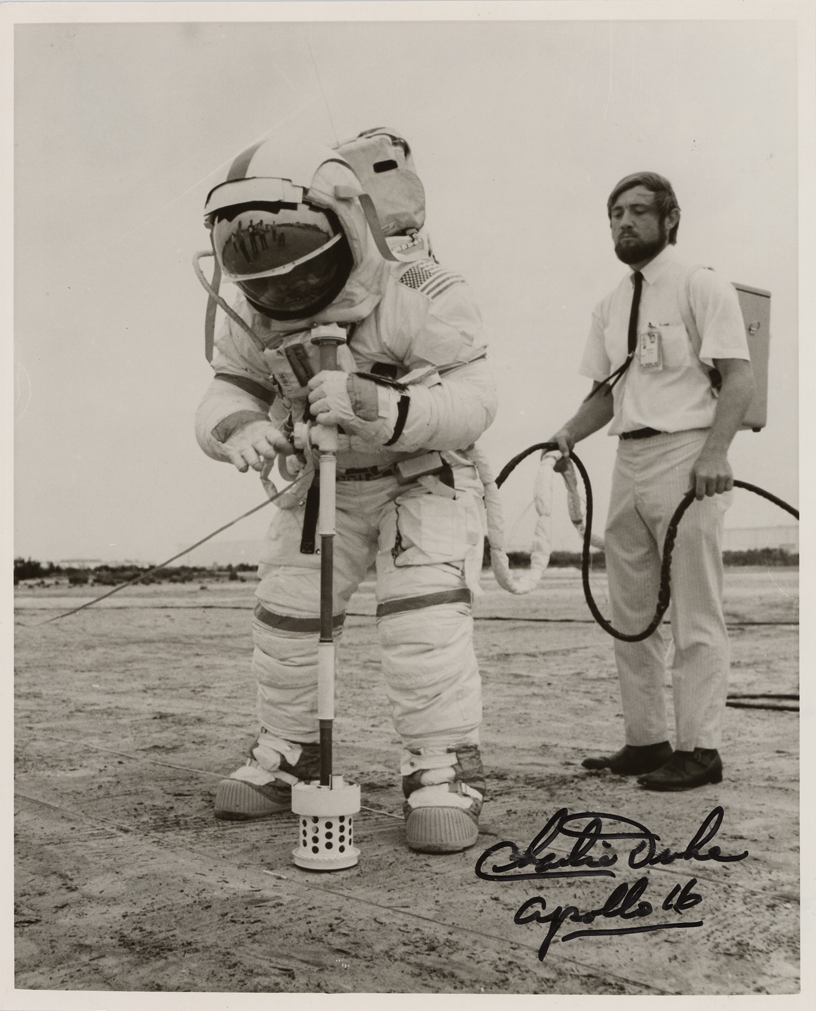 Official glossy 8 x 10 NASA photo of Charlie Duke using a Thumper for firing charges during EVA training, signed in black felt tip, "Charlie Duke, Apollo 16." Reverse bears purple NASA caption text. In very good to fine condition, with scattered light creasing, a small tear to right edge, and a paperclip impression to the top edge.