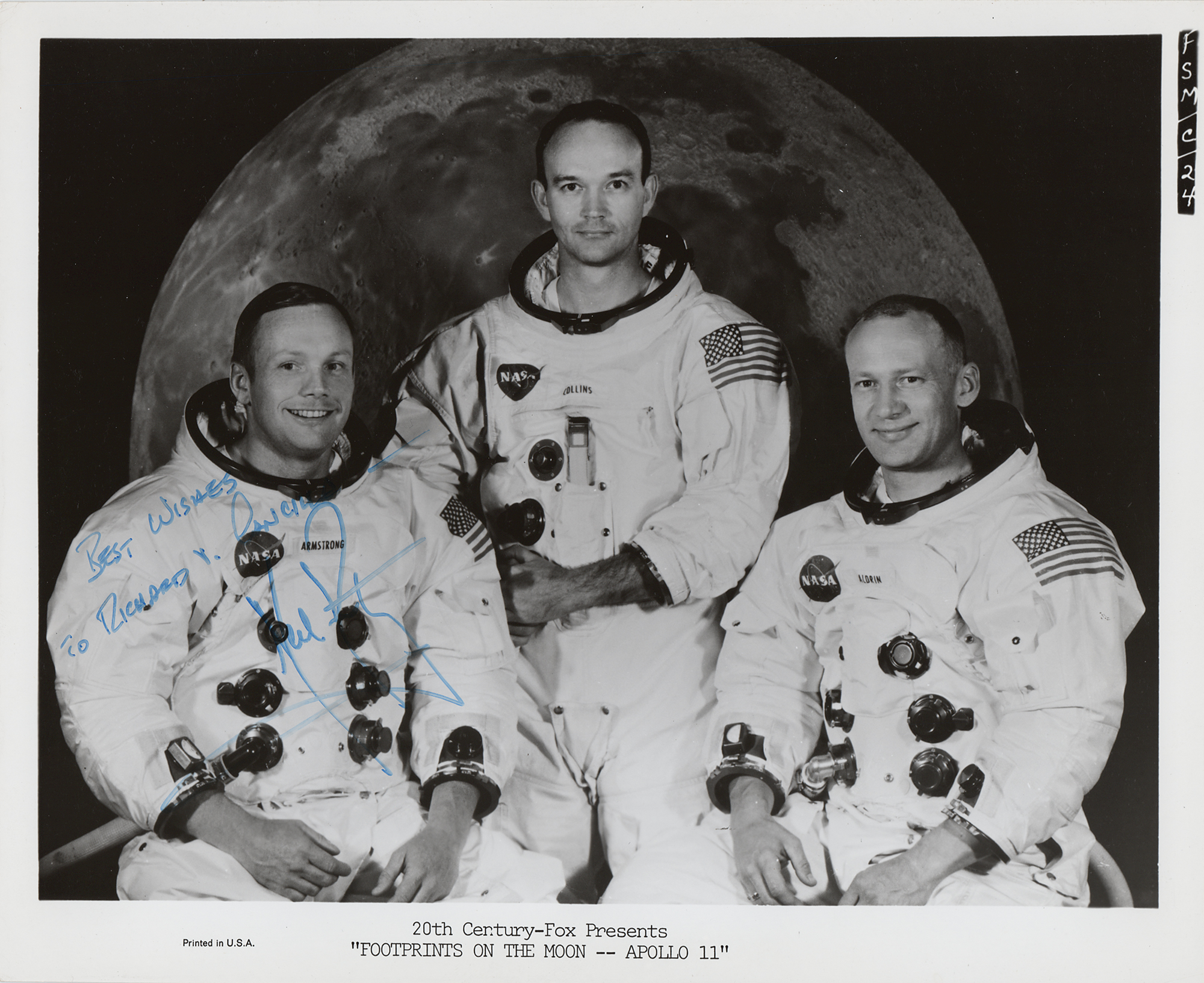 Uncommon glossy 10 x 8 20th Century-Fox publicity photo for the 1969 documentary Footprints on the Moon: Apollo 11, signed and inscribed in blue felt tip, "Best wishes to Richard Y. Cancilla, Neil Armstrong.” In fine condition, with scattered small surface creases.