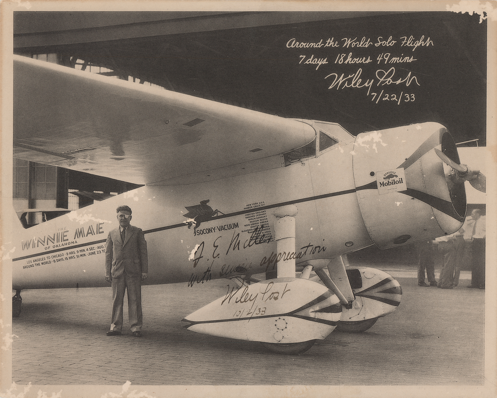 Vintage matte-finish 10 x 8 promotional photo of Post posing with his Winnie Mae aircraft, signed and inscribed in fountain pen, "F. E. Miller, with sincere appreciation, Wiley Post, 10/2/33.” Upper portion bears a printed facsimile signature. In very good to fine condition, with scattered areas of surface loss. Accompanied by a photo of the same pose, signed and inscribed by Post's wife Mae. In October 1926, Post was badly injured in an oil-rig accident when a piece of metal pierced his left eye. An infection permanently blinded him in that eye, and he typically wore an eyepatch thereafter. Post and the Winnie Mae, a special Lockheed Model 5C Vega, completed two around-the-world record flights and a series of special high-altitude substratospheric research flights. It was named for the daughter of its original owner, F. C. Hall, who hired Post to pilot the plane.