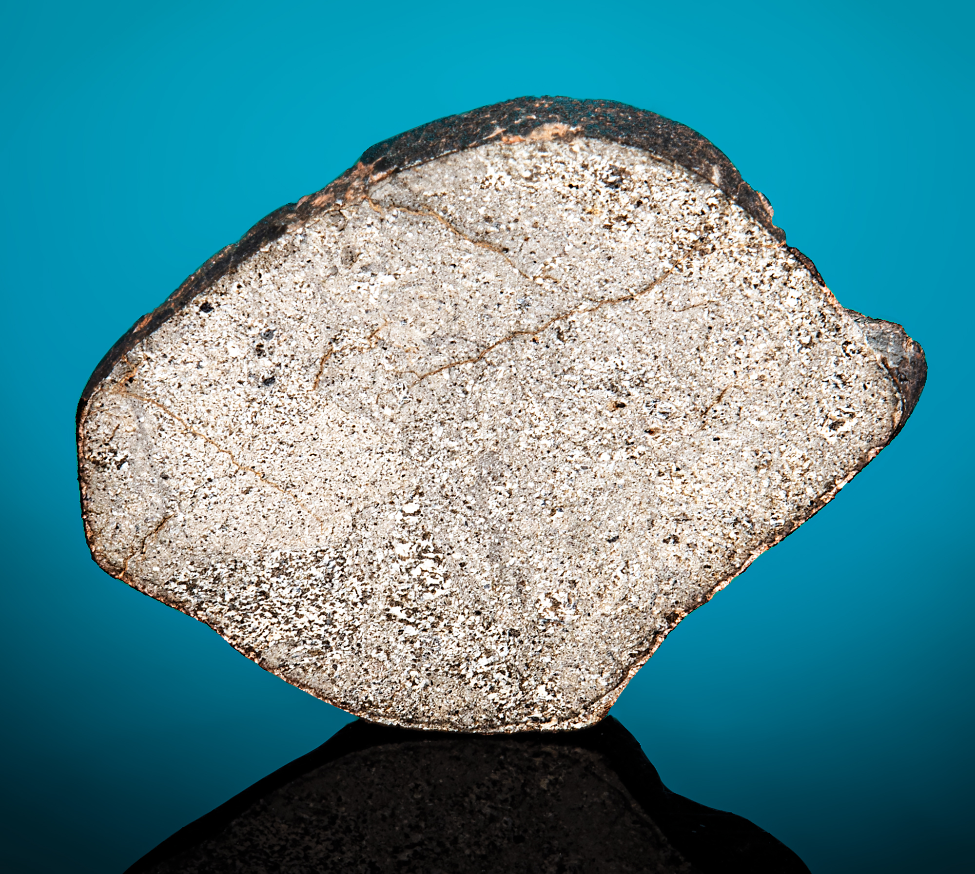 Vesta is the second largest asteroid in our solar system. Billions of years ago there were other large asteroids which fragmented and continued to orbit the Sun between Mars and Jupiter. We refer to these fragments ? large and small ? as the asteroid belt. This meteorite is a basalt; it originated from an ancient volcano on Vesta and the cut and polished face reveal the classic presentation of what is referred to as a ?monomict? eucrite as the clasts seen originate from a single rock type. Exceedingly fresh, clusters of large grains populate one end of the specimen. The side features patches of fusion crust (from the meteorite?s fiery descent through Earth?s atmosphere) and the reverse is a naturally fractured with earthen accents from the meteorite?s residency in the Sahara. This is a fascinating representation of a richly evocative meteorite.