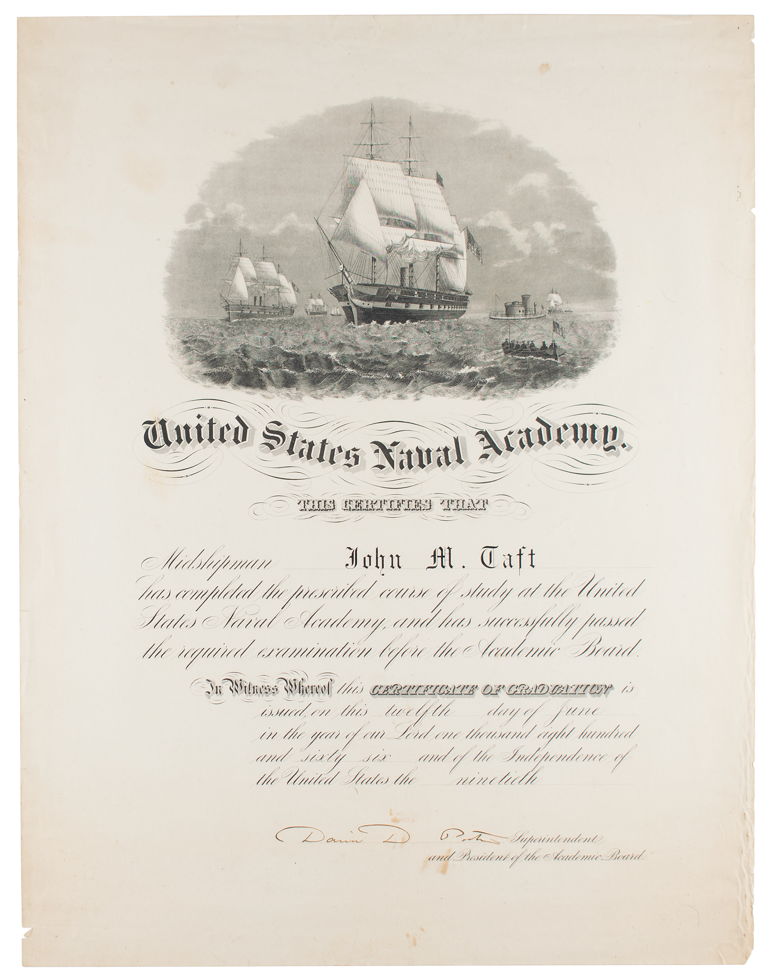Partly-printed DS, one page, 17.75 x 23, June 12, 1866. Certificate of graduation from the United States Naval Academy for Midshipman John M. Taft. Signed at the conclusion in fountain pen by David D. Porter as the academy's superintendent and as president of the academic board. In very good to fine condition, with scattered light creasing (heavier to the lower right edge), some small stains, and some short edge tears.