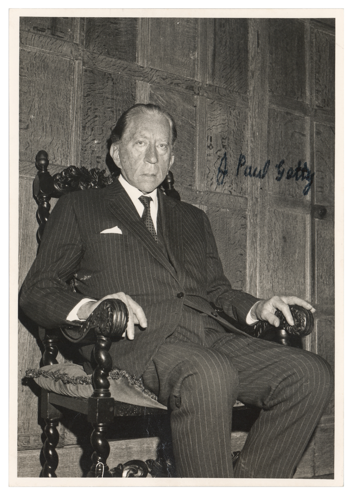 Vintage matte-finish 4.5 x 6.5 photo of J. Paul Getty seated in a large wooden chair, signed in black ink. In very good condition, with two areas of creasing, a diagonal crease passing through Getty's right side, and light silvering to the darker areas of the image.