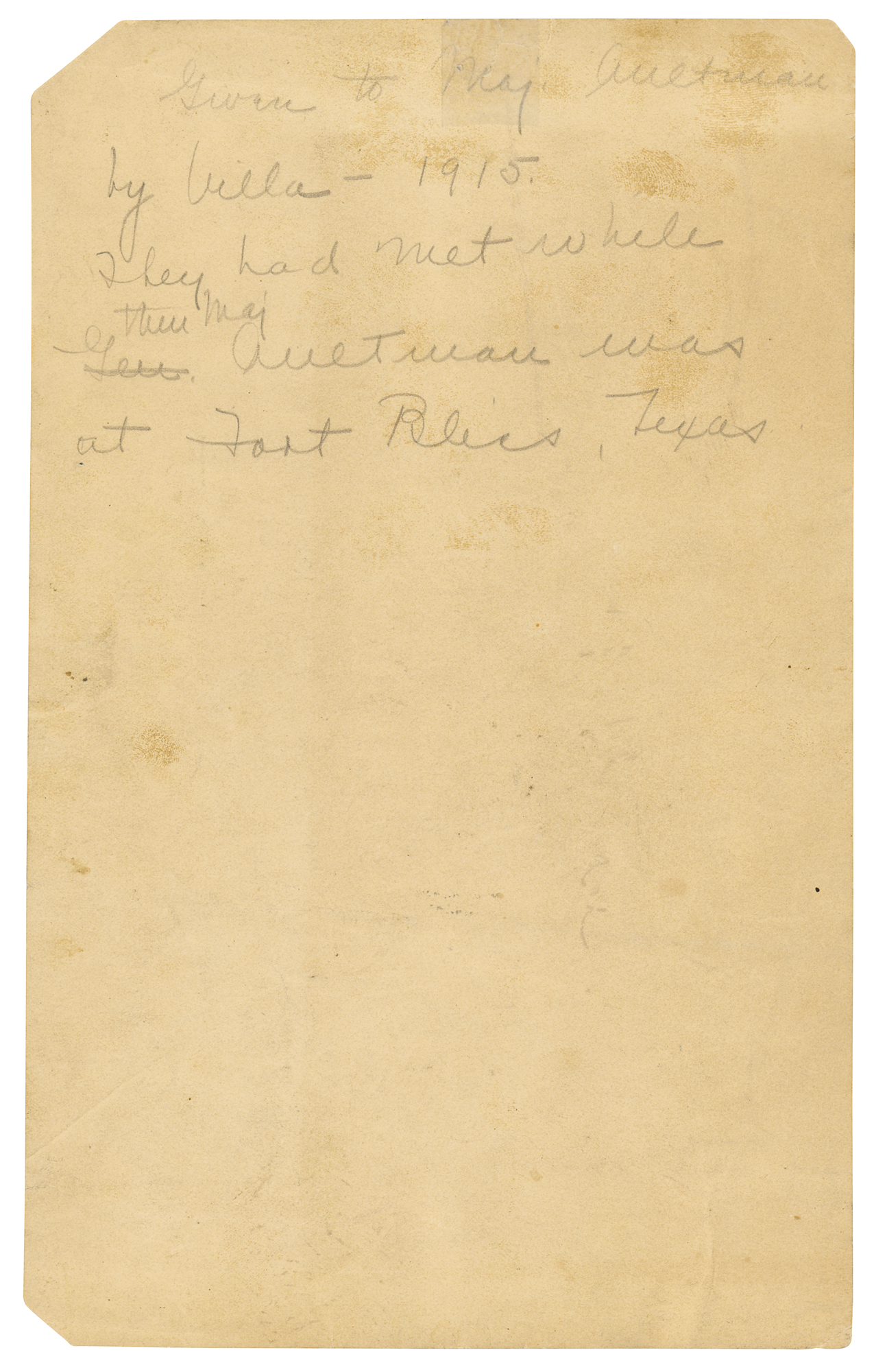 Extremely rare matte-finish 6.75 x 10.75 photo of Villa in full uniform, prominently signed in ink, "Francisco Villa." Reverse bears a collector's notation in pencil, "Given to Maj. Aultman by Villa-1915. They had met while then Maj. Aultman was at Fort Bliss, Texas." In very good condition, with trimmed edges, clipped corner tips, a small repaired tear to top edge, and a fleck of surface loss to the left of the signature. This portrait shows Villa during the Mexican Revolution around the time he was making the autobiographical film The Life of General Villa with D. W. Griffith. The unusual film incorporated authentic footage from actual battles and staged scenes and starred Pancho Villa himself. Extremely rare in this format, this is the first signed photograph of the revolutionary we have offered.