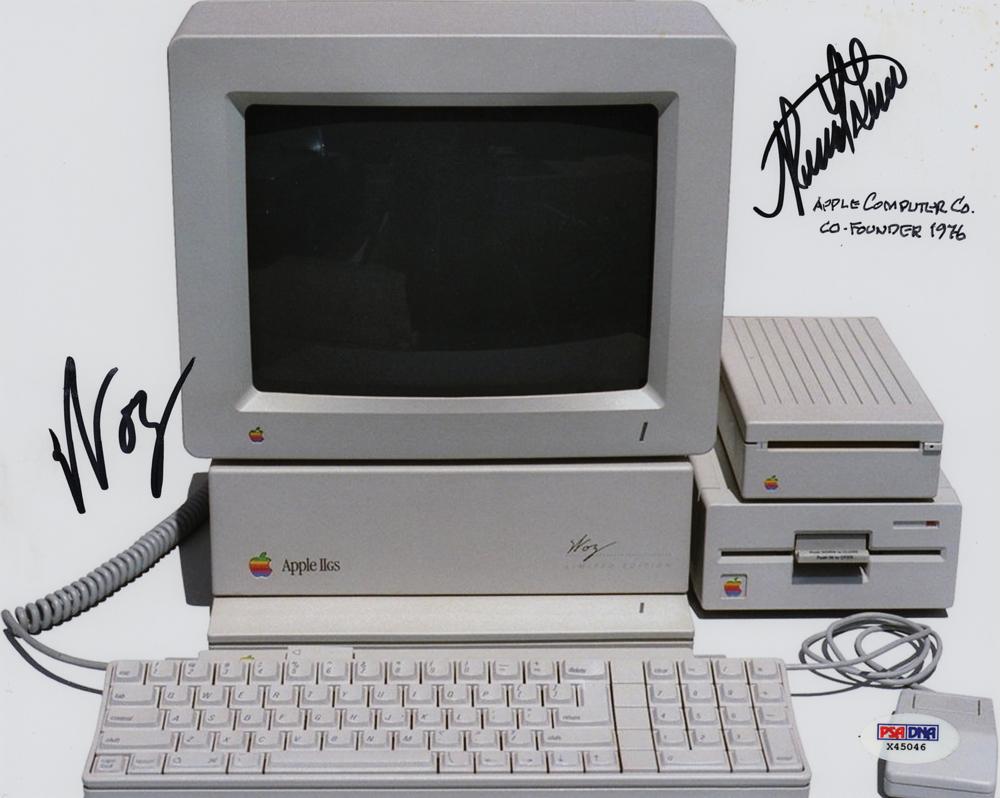 Color satin-finish 10 x 8 photo of the Apple IIGS computer, signed in black felt tip by two of Apple's co-founders, Steve Wozniak, "Woz," and Ron Wayne, "Ronald G. Wayne, Apple Computer Co., Co-Founder 1976," who signs over his embossed personal seal. In fine condition, with a PSA/DNA label affixed to the lower right corner and some trivial spotting to the upper right.