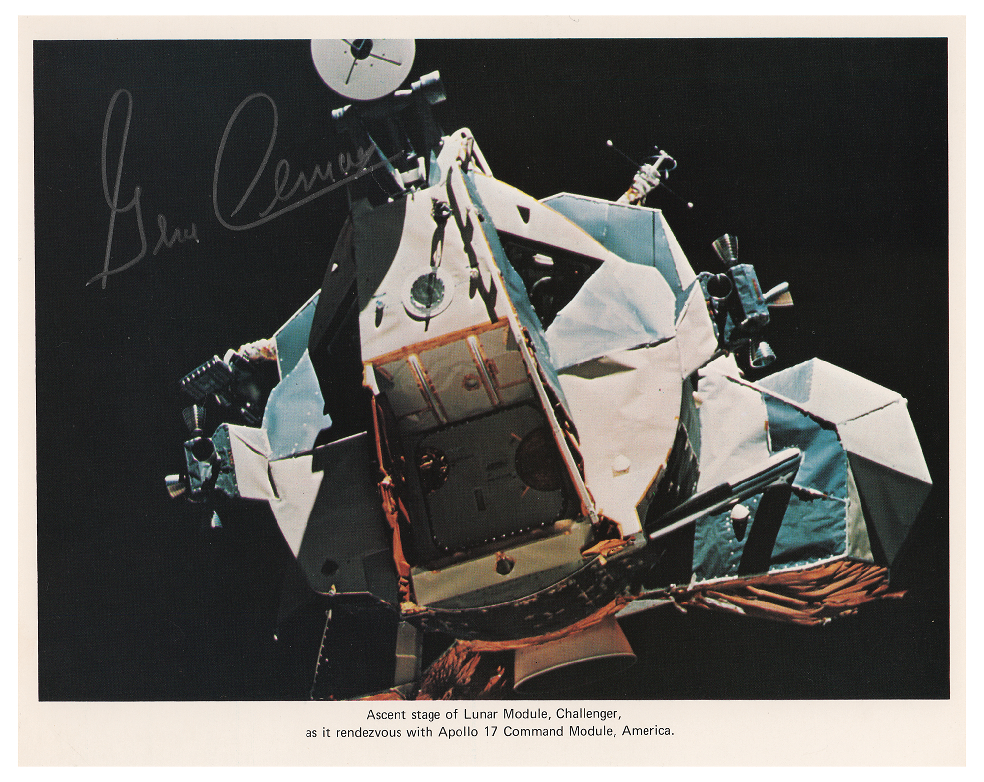 Official color 10 x 8 NASA lithograph of the Lunar Module Challenger during the Apollo 17 mission, signed in silver ink by Gene Cernan. In fine condition, with a few small surface creases. Accompanied by a certificate of authenticity from Novaspace.