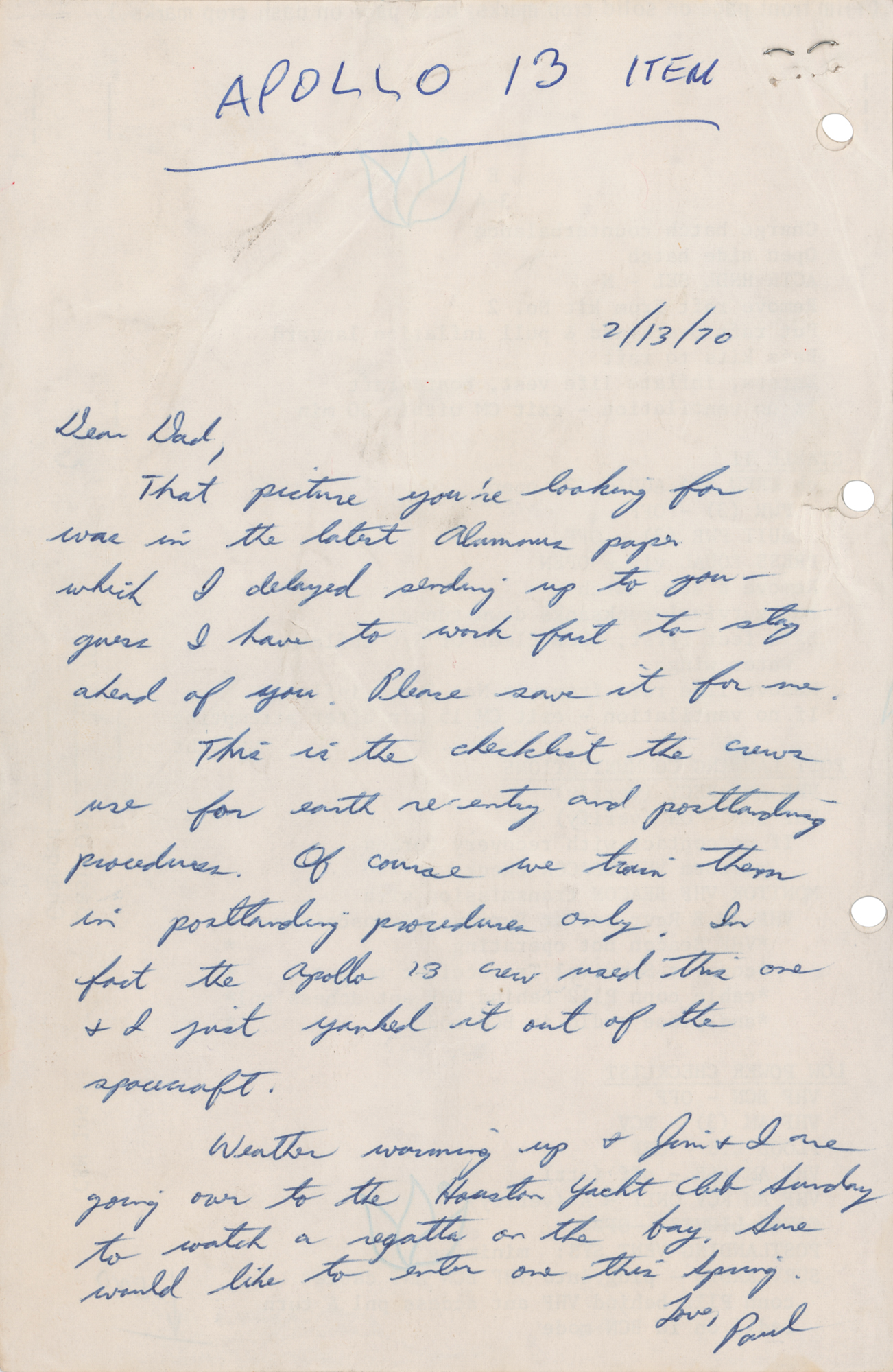 Packet of four training-used Apollo 13 post-landing checklist pages used in a 'boilerplate' CM during water egress training exercises, 6 x 9, signed on the first page in black ballpoint, "Used by the crew in training, Fred Haise, Apollo 13 LMP." On the reverse of the last page is a handwritten note from a NASA employee to his dad, dated February 13, 1970, in part: "This is the checklist the crews use for earth re-entry and postlanding procedures. Of course we train them in postlanding procedures only. In fact the Apollo 13 crew used this one & I just yanked it out of the spacecraft." In very good condition, with overall staining from use.