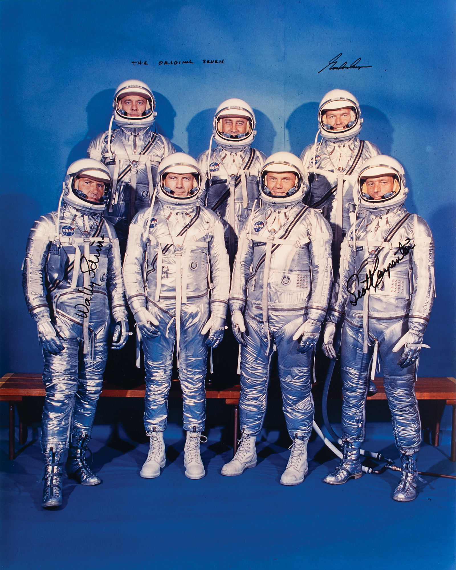 Large color satin-finish 16 x 20 photo of the iconic group shot of the original seven Mercury astronauts posing together in their silver space suits, signed in black felt tip, "The Original Seven, Gordon Cooper," "Wally Schirra," and "Scott Carpenter." In fine condition.