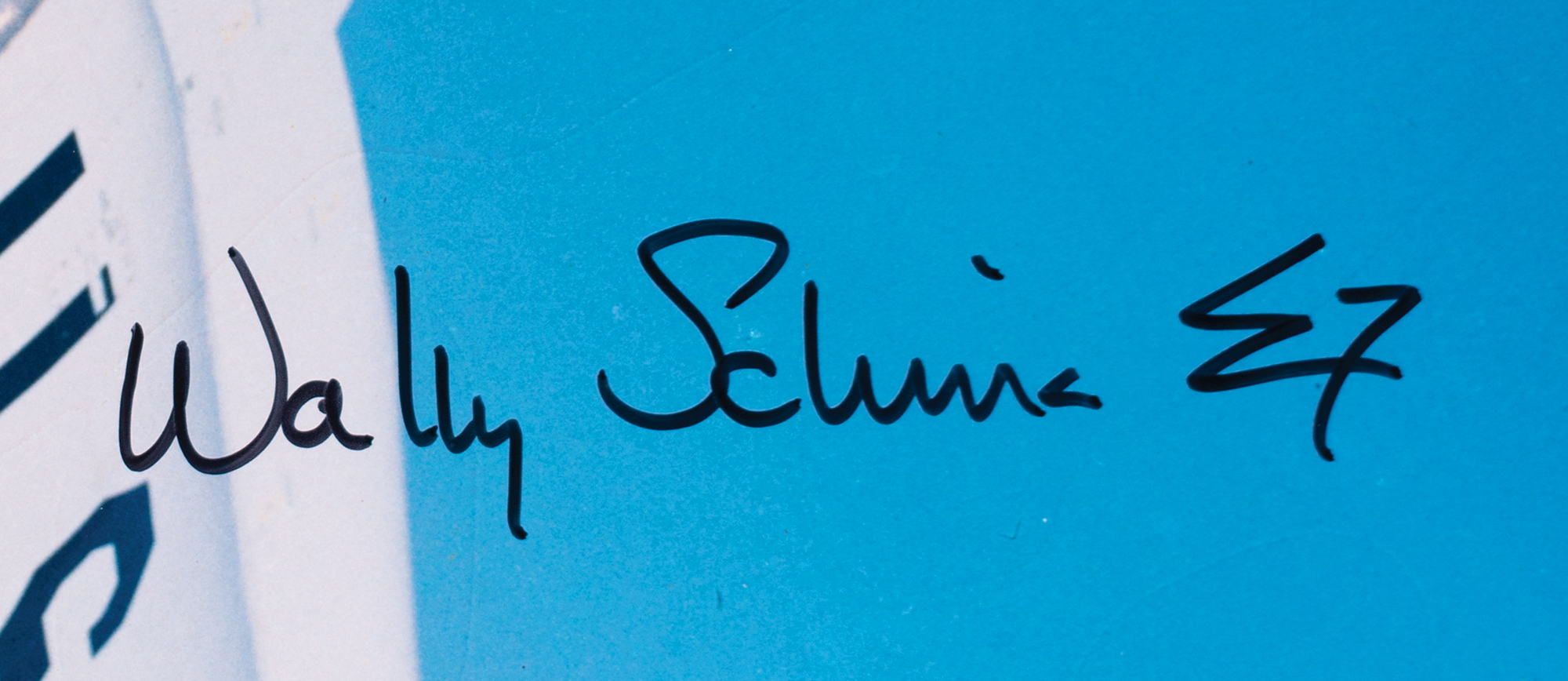 Crystal-clear color satin-finish 20 x 16 photo of the original Mercury astronauts posing in front of a Convair F106-B aircraft at Langley Air Force Base on January 20, 1961, signed in black felt tip, "Wally Schirra, Sigma 7," "Scott Carpenter, Aurora 7," and in blue felt tip, "Project Mercury Astronauts, The Original 7, Gordon Cooper, Faith 7." In fine condition.