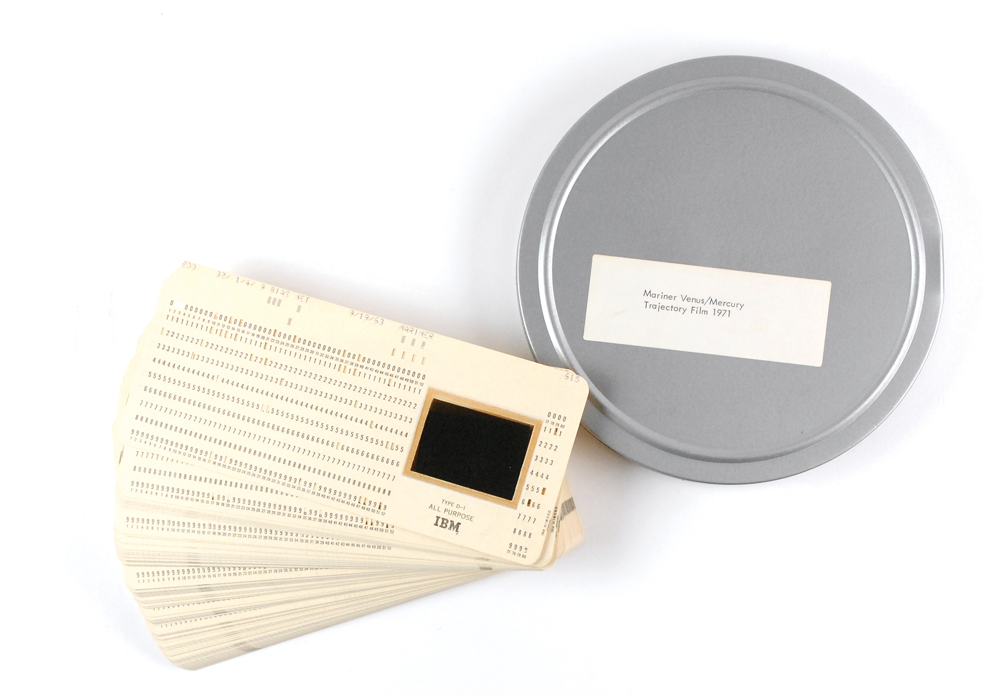 Two items from the Mariner interplanetary probe program: a collection of approximately 200 IBM Type D-1 All Purpose keypunch cards from 1963 associated with various Mariner components (e.g. "Emitter," "HTC Clock," "Mother Board," "Insulator," etc.), retaining negatives with schematics or listings of the spacecraft's components; and a canister of film, 7.25″ in diameter, labeled on the cover, "Mariner Venus/Mercury Trajectory Film 1971," with animated diagrams of flight trajectories. In overall fine condition.