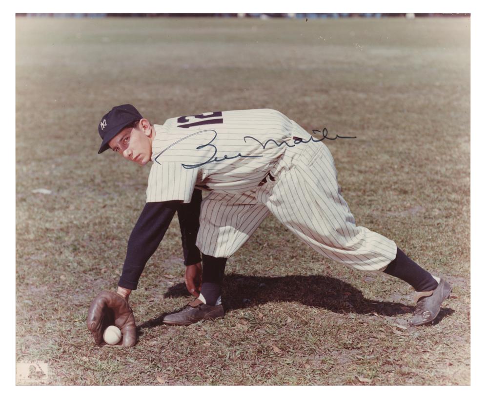 Color glossy 9.75 x 8 full-length photo of Billy Martin snagging a baseball as the second baseman for the New York Yankees, signed in black felt tip. In fine condition.
