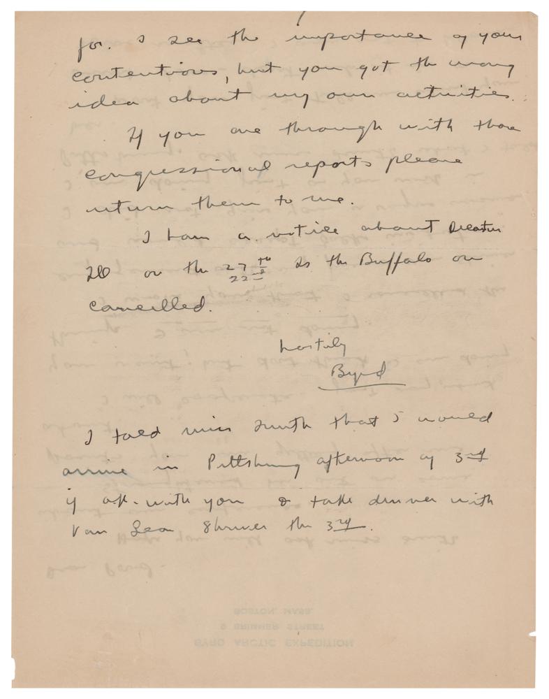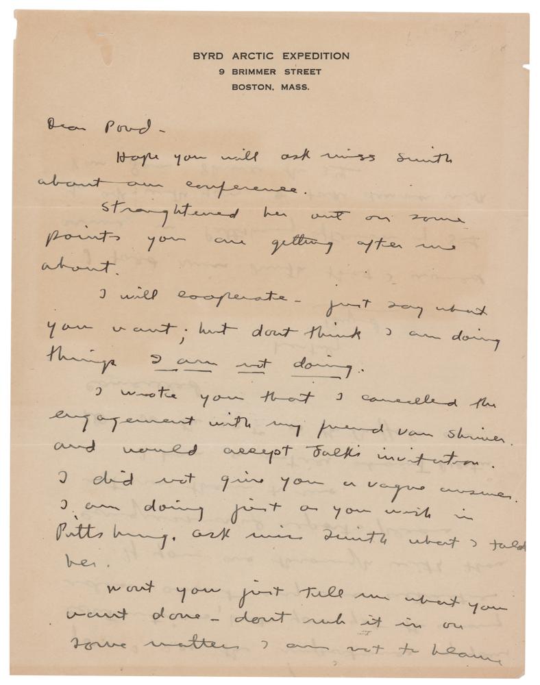 ALS signed “Byrd,” one page both sides, 8.5 x 11, Byrd Arctic Expedition letterhead, no date. Frustrated handwritten letter to an associate, in part: "Hope you will ask Miss Smith about our conference. Straightened her out on some points you are getting after me about. I will cooperate—just say what you want; but don't think I am doing things I am not doing. I wrote you that I cancelled the engagement with my friend Van Shriner and would accept Falk's invitation. I did not give you a vague answer. I am doing just as you wish in Pittsburg. Ask Miss Smith what I told her. Won't you just tell me what you want done—don't rub it in on some matters I am not to blame for. I see the importance of your contentions, but you got the wrong idea about my own activities." In very good to fine condition, with a paperclip impression to the top edge, and some light irregular toning. Accompanied by a full letter of authenticity from JSA.