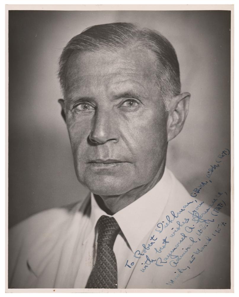 US Navy admiral during World War II (1886-1969) remembered for commanding forces during the Battle of Midway and the Battle of the Philippine Sea. Vintage glossy 7.75 x 10 head-and-shoulders photo, signed and inscribed in fountain pen, "To Robert Viehlman, C.B.M., U.S.N. (Ret.), with best wishes from Raymond A. Spruance, Admiral, U.S.N. (Ret.), Manila, 25 March 1954.” In very good to fine condition, with scattered small surface impressions.