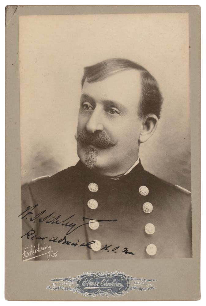 Naval officer (1839-1911) who commanded the destruction of the Spanish fleet at Santiago de Cuba and who led the expedition to rescue Adolphus Greeley in the arctic. Scarce 4.25 x 6.5 cabinet photo of Schley in uniform by Elmer Chickering, boldly signed in ink, "W. S. Schley, Read Admiral, U.S.N." In fine condition, with a crease to the upper left corner tip.