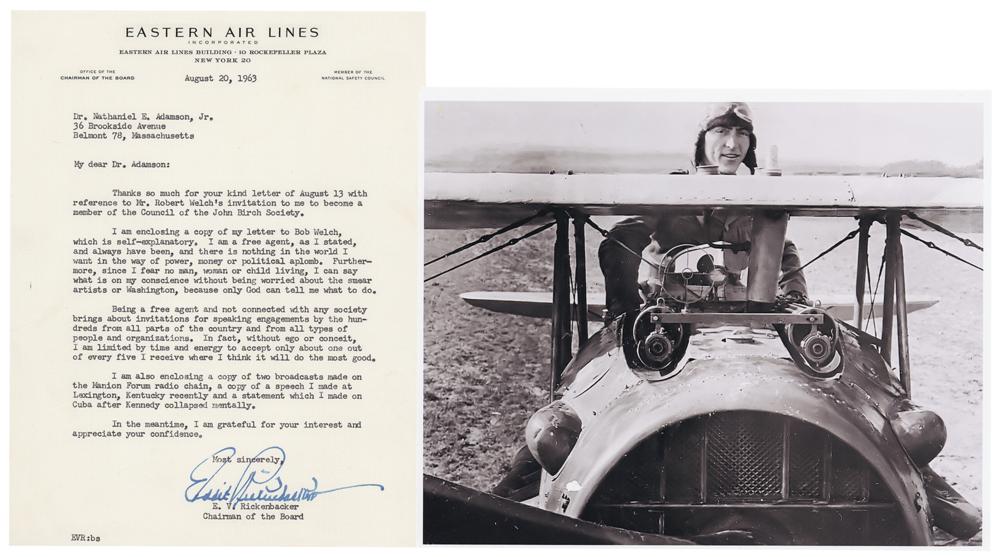 TLS, one page, 7 x 9.25, Eastern Air Lines letterhead, August 20, 1963. Letter to Nathaniel Adamson, a member of the John Birch Society's National Council, regarding an invitation to become a member. In part: "I am a free agent?and there is nothing in the world I want in the way of power, money or political aplomb. Furthermore, since I fear no man, woman or child living, I can say what is on my conscience without being worried about the smear artists or Washington, because only God can tell me what to do." In fine condition. Accompanied by an unsigned glossy 10 x 8 photo of Rickenbacker in the cockpit of a biplane.