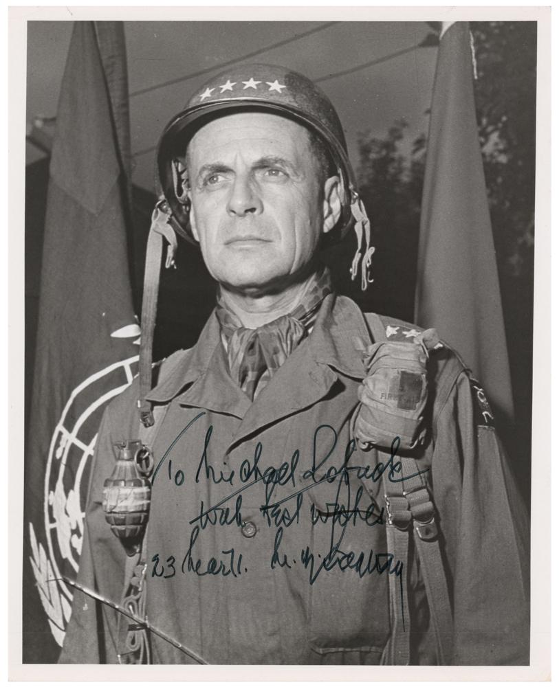 Glossy 8 x 10 photo of Gen. Ridgway in uniform, signed and inscribed in black felt tip, "To Michael Robuck, with best wishes, M. B. Ridgway, 23 Mar. 71." Reverse bears a US Army credit stamp. In fine condition.