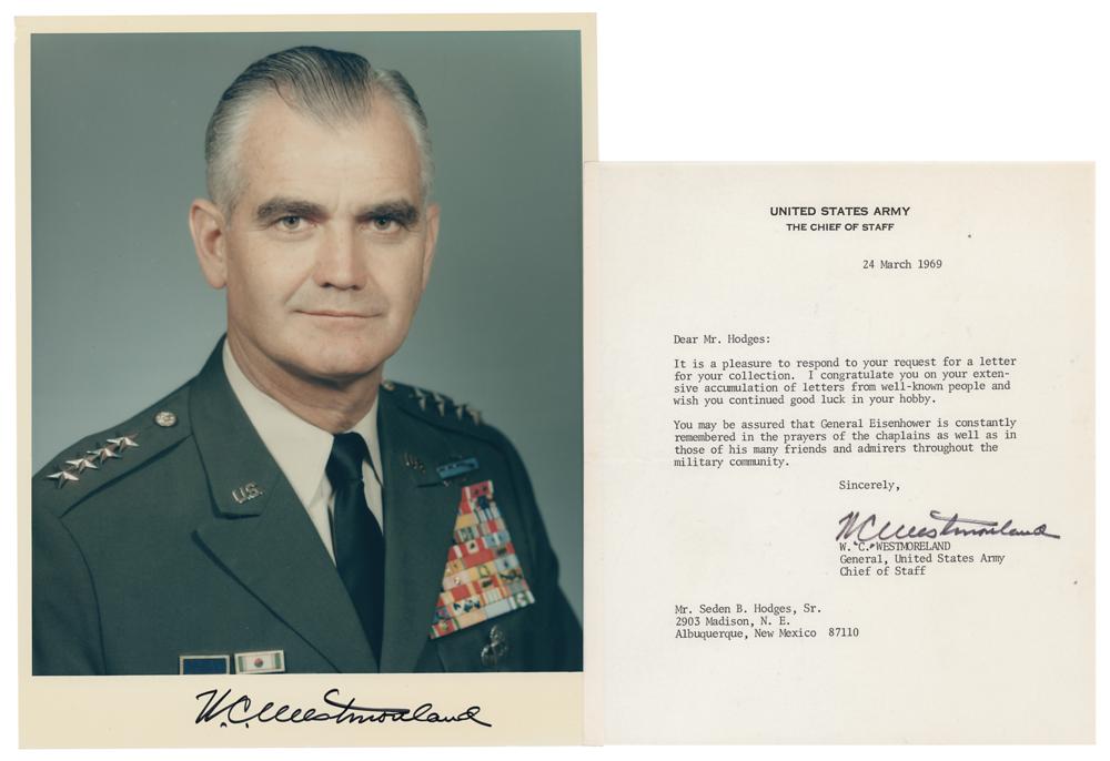 Two items: a color glossy 8 x 10 photo of Westmoreland in uniform, signed in the lower border in black felt tip, "W. C. Westmoreland'; and a TLS signed "W. C. Westmoreland," one page, 7 x 8, United States Army Chief of Staff letterhead, March 24, 1969, in part: "You may be assured that General Eisenhower is constantly remembered in the prayers of the chaplains as well as in those of his many friends and admirers throughout the military community." In overall fine condition.
