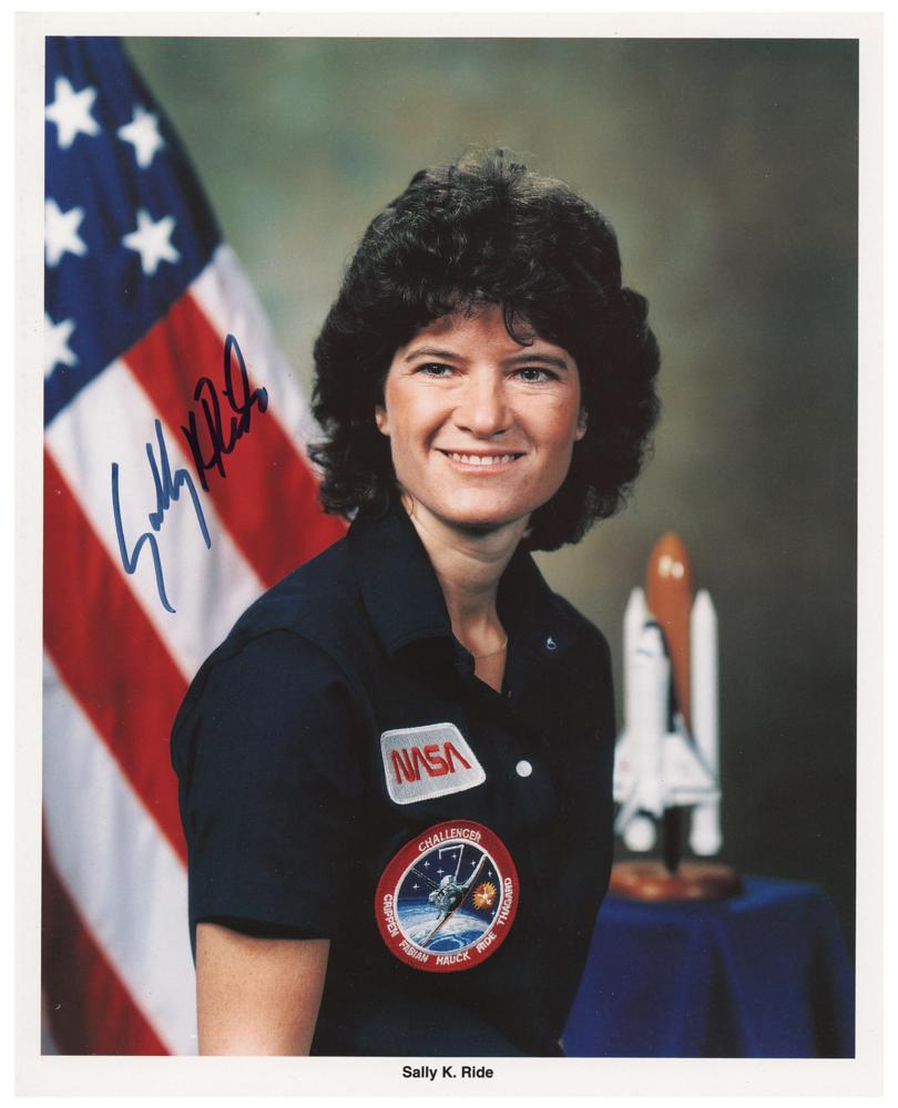 Official color 8 x 10 NASA lithograph of Ride posing with an STS-7 patch on her shirt, signed in blue felt tip, "Sally K. Ride." In fine condition.