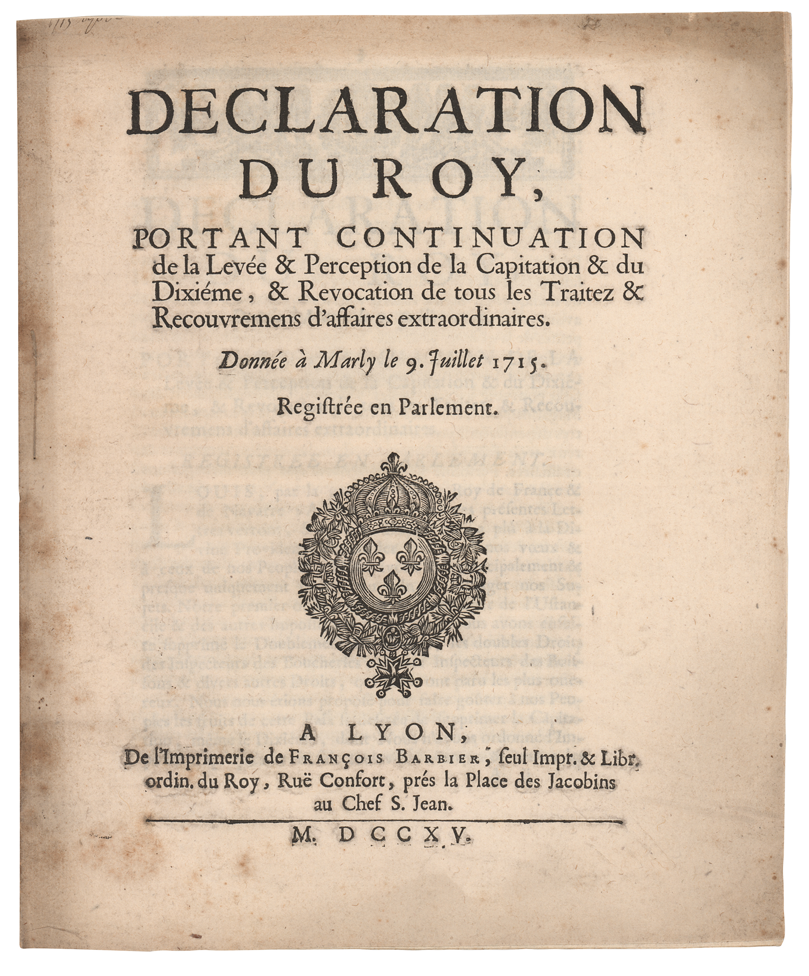Printed booklet in French, seven pages, 7.75 x 9.25, July 9, 1715. Printed declaration of King Louis XIV on the subject of taxation, entitled (translated): "On the continuation of the levying and collection of the capitation and the tenth, and revocation of all transactions and recoveries of business." In very good to fine condition, with scattered light foxing, and toning to the edges of the front cover.