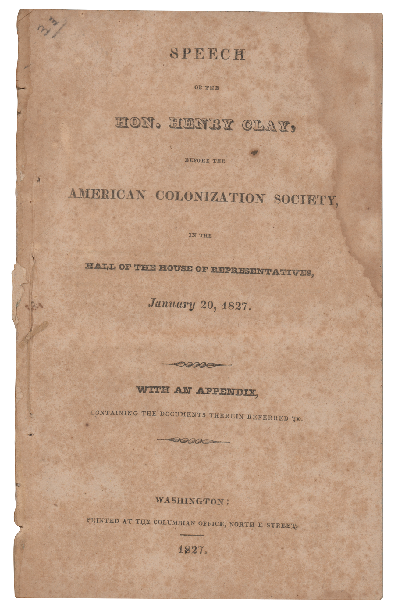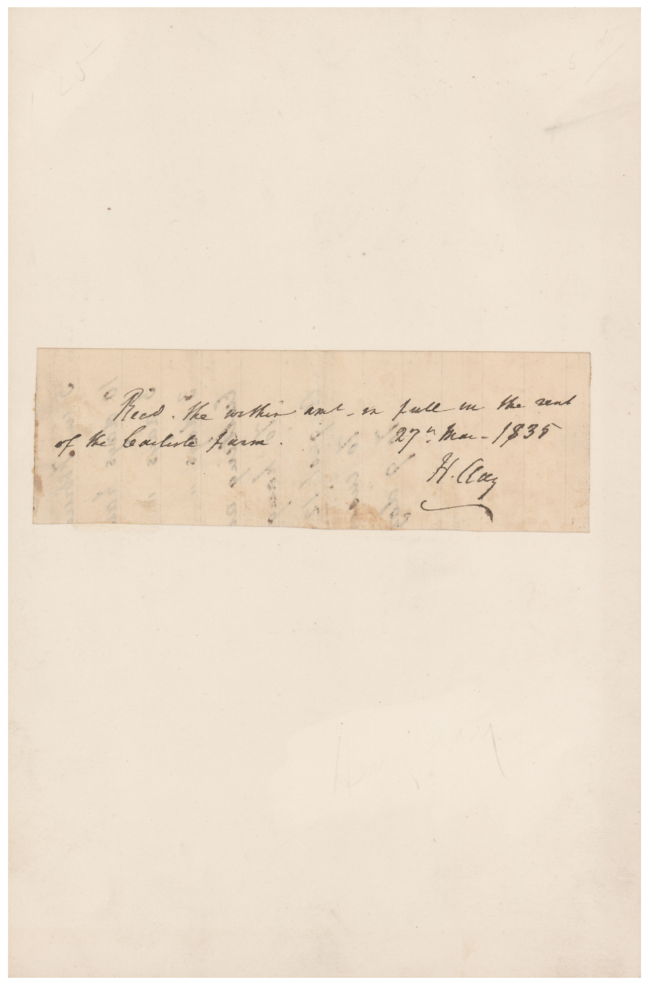 ADS signed "H. Clay," on a 5 x 1.75 slip, March 27, 1835. Handwritten financial receipt, in full: "Rec'd the within amt in full the rent of the Carlisle farm." Affixed to a larger page and in fine condition, with a small stain to the bottom. Accompanied by an unsigned original booklet of Clay's speech "before the American Colonization Society," on January 20, 1827, printed at the request of the Society.